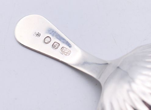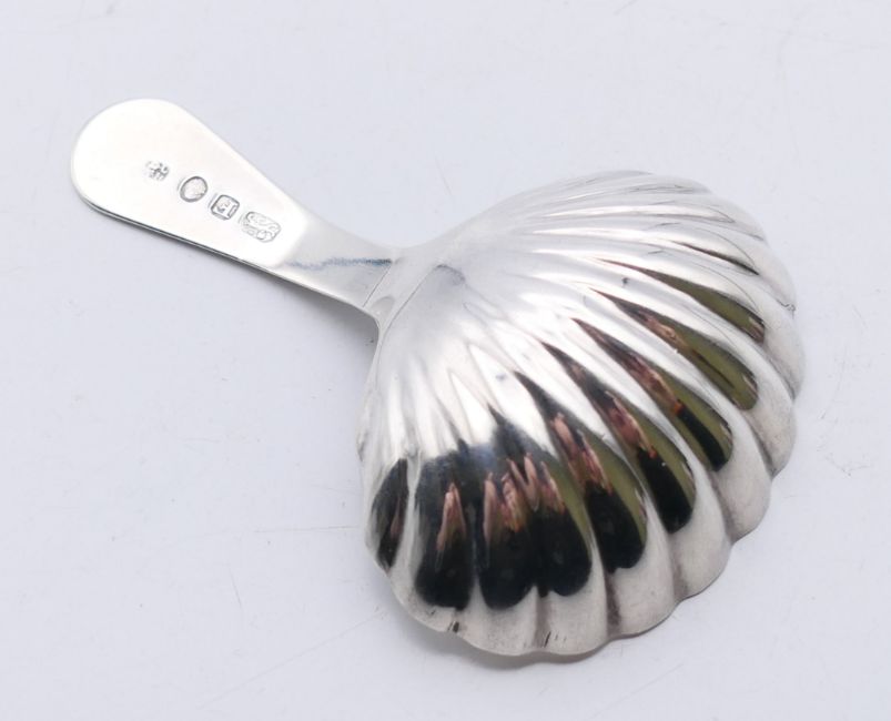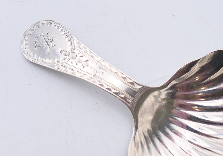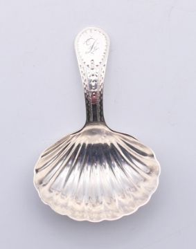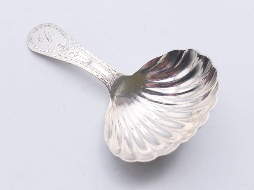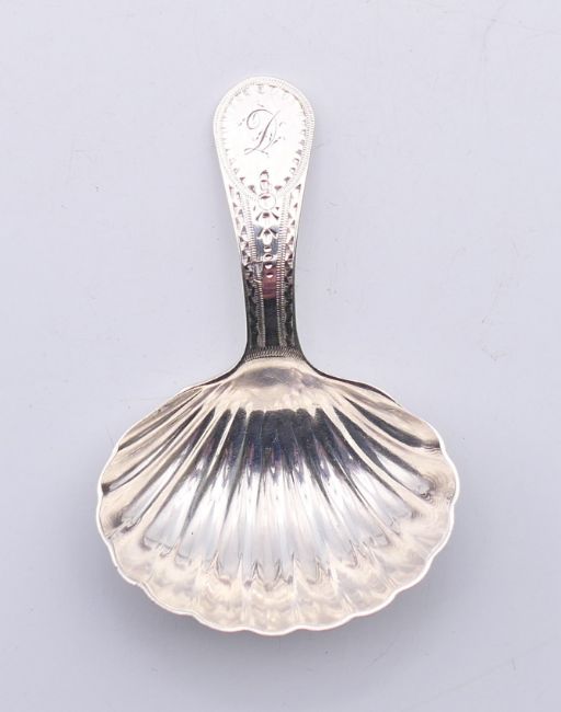 A silver George III caddy spoon with shell-shaped bowl, circa 1803. 8 cm high.