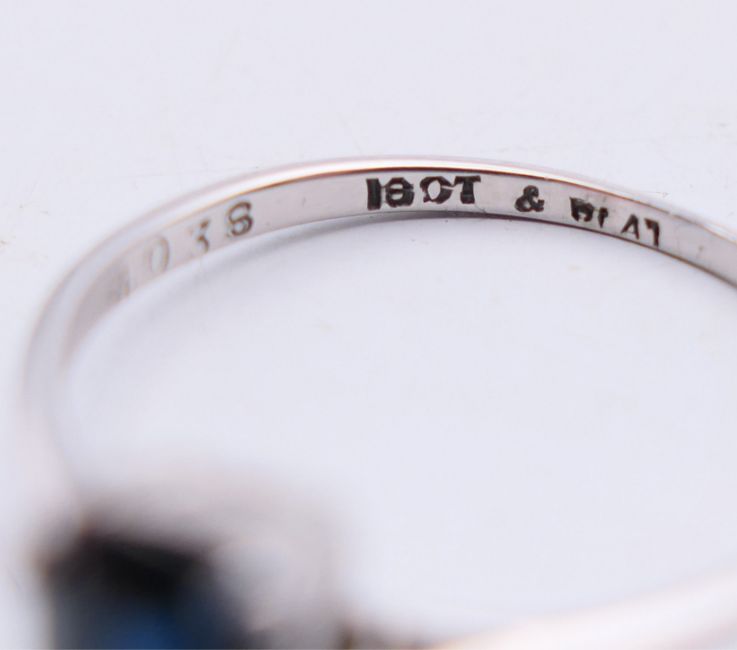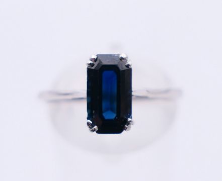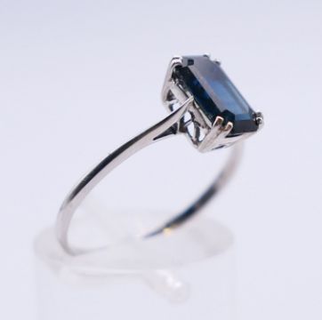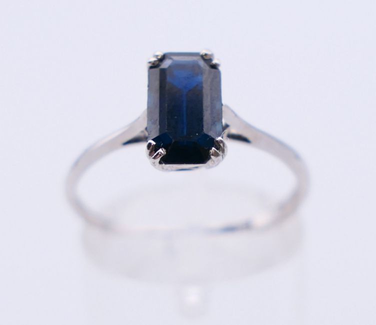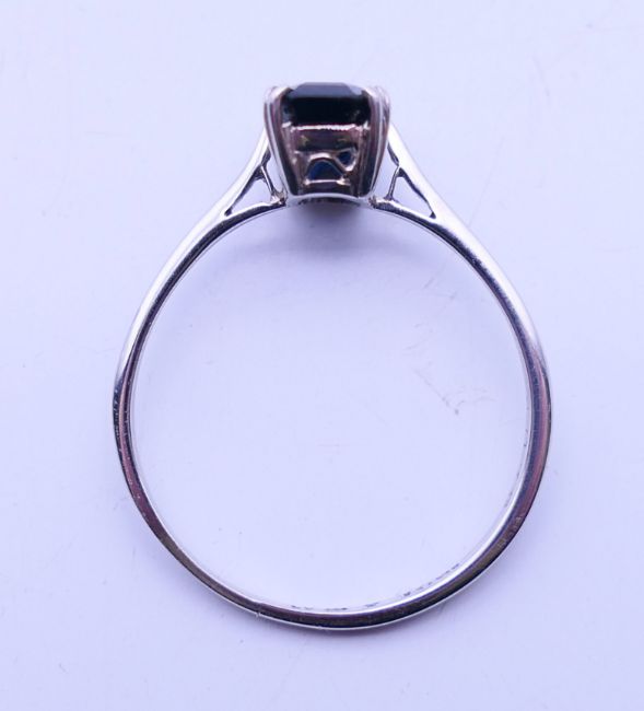 An 18 ct white gold and sapphire ring. Ring size P.
