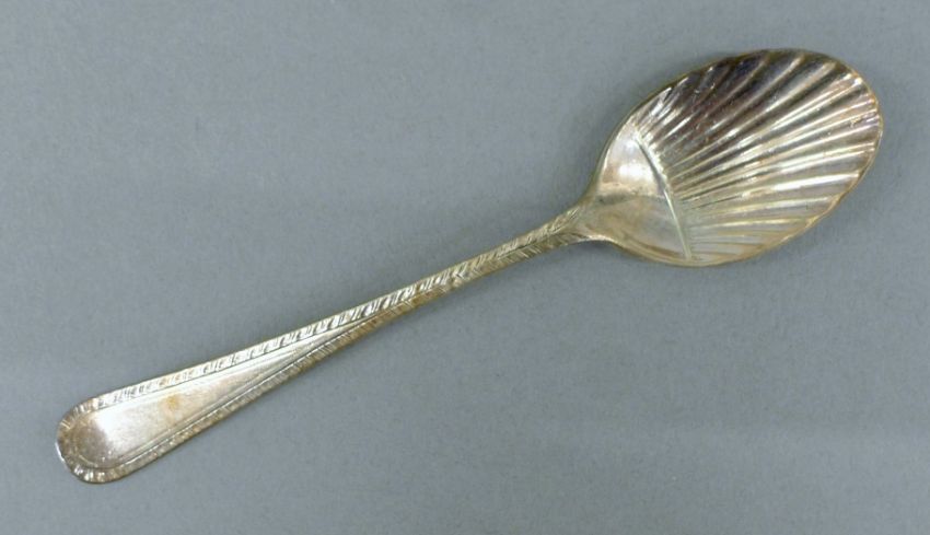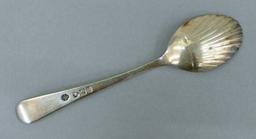 A cased set of silver teaspoons and tongs. The case 19.5 cm wide. 90.5 grammes.