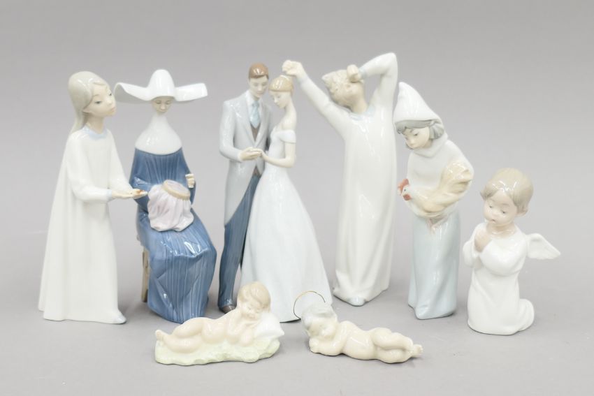 A quantity of Lladro porcelain figures. The largest 21.5 cm high.