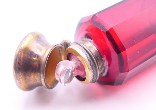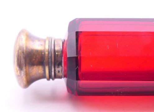 A Victorian ruby glass double ended scent bottle. 12.5 cm long.