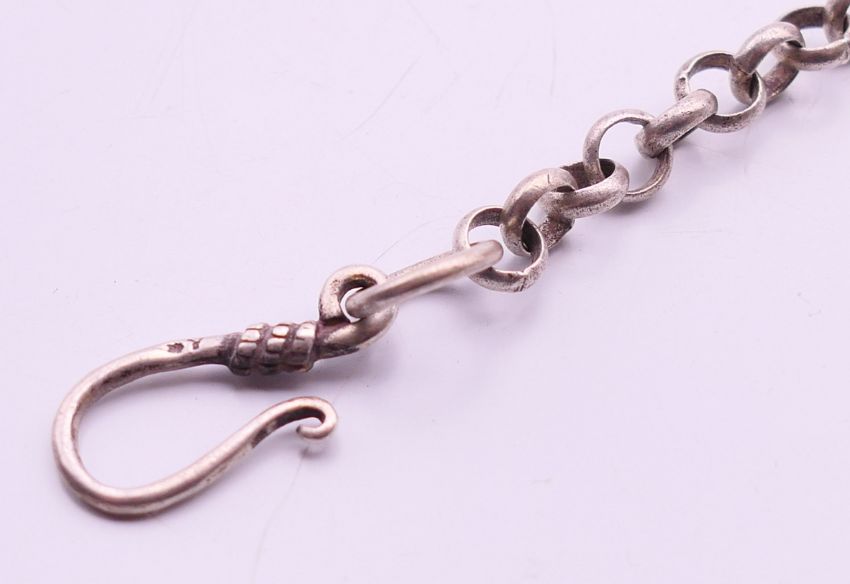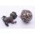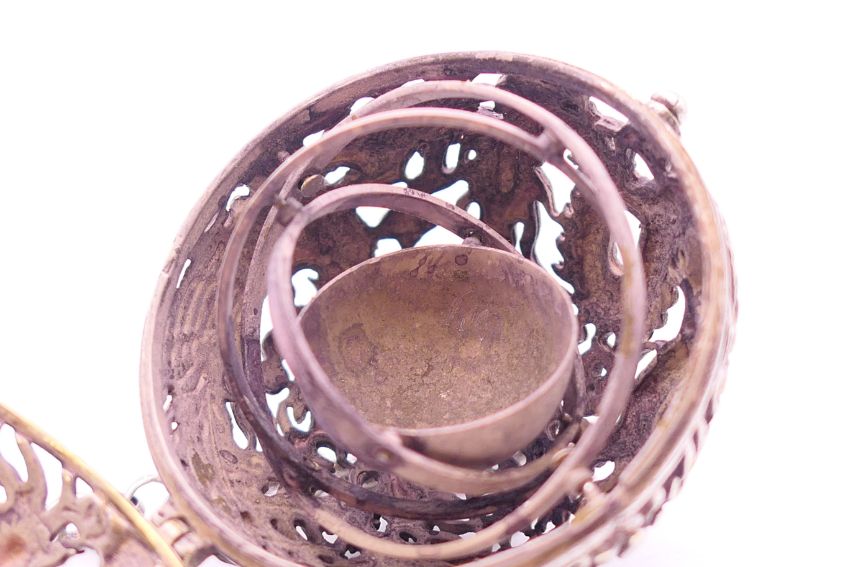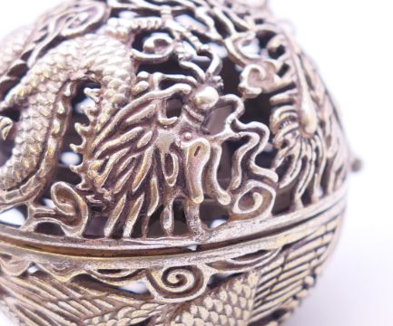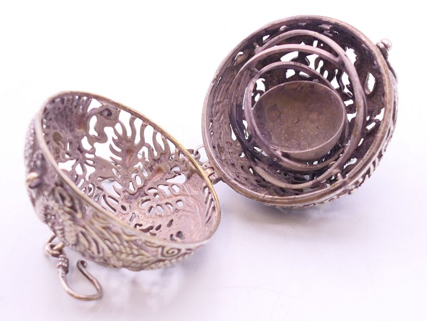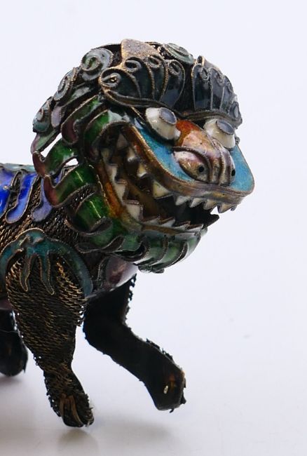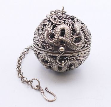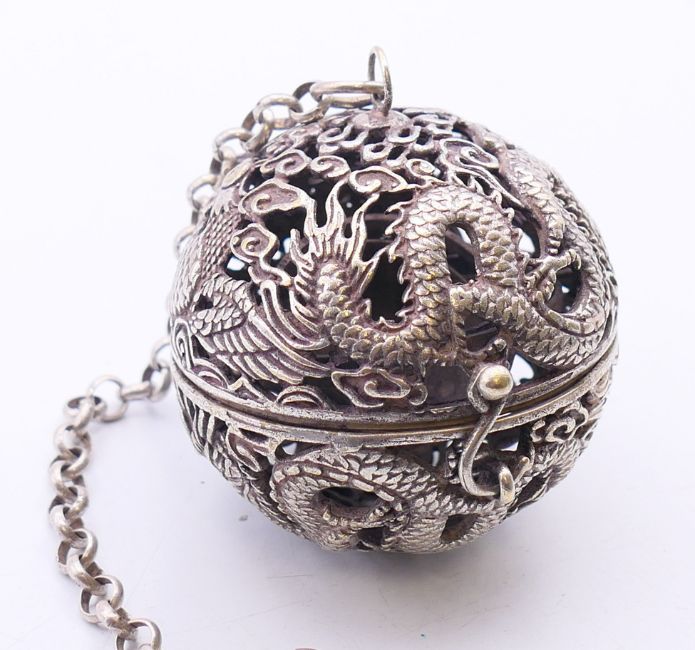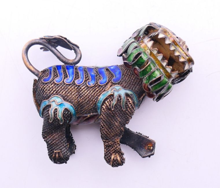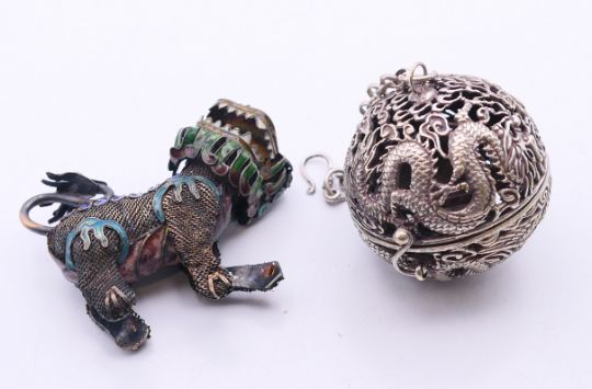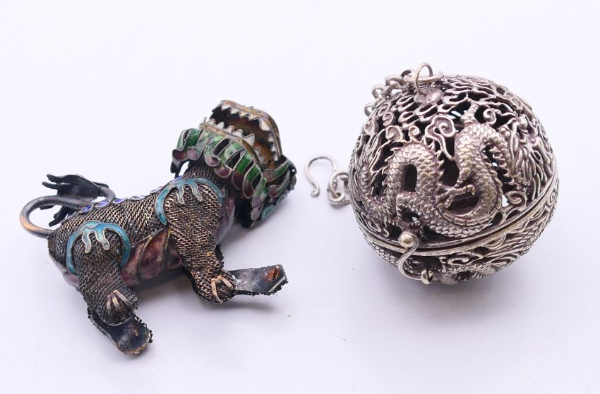 A 19th century Chinese silver and enamelled temple lion and a small spherical censer on a suspension chain. Temple lion 6 cm high, censer 5.5 cm diameter.