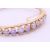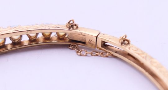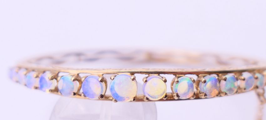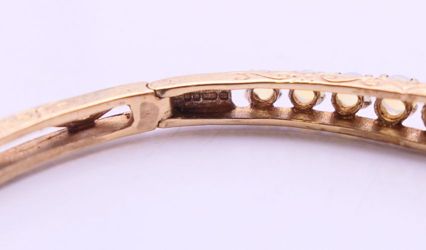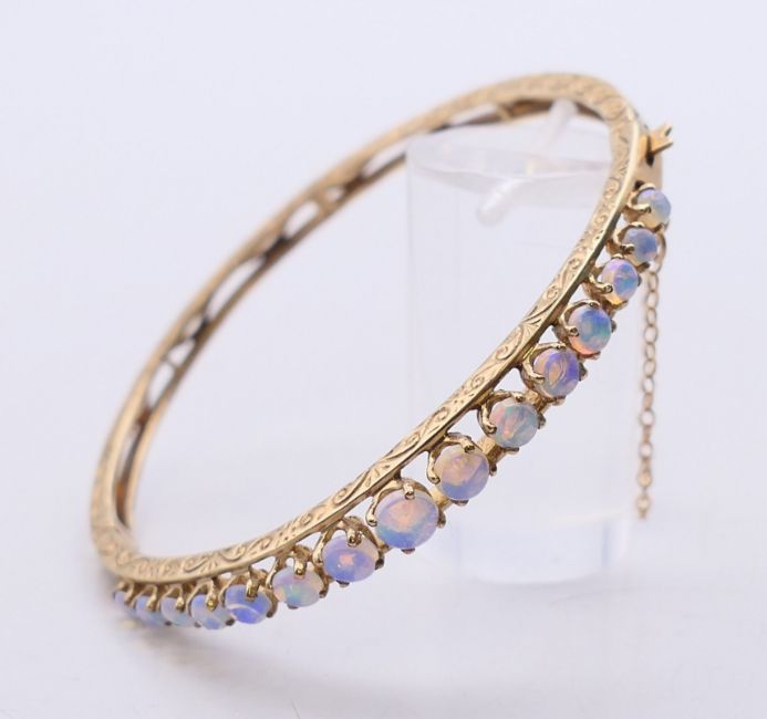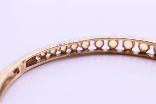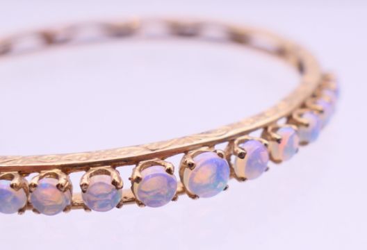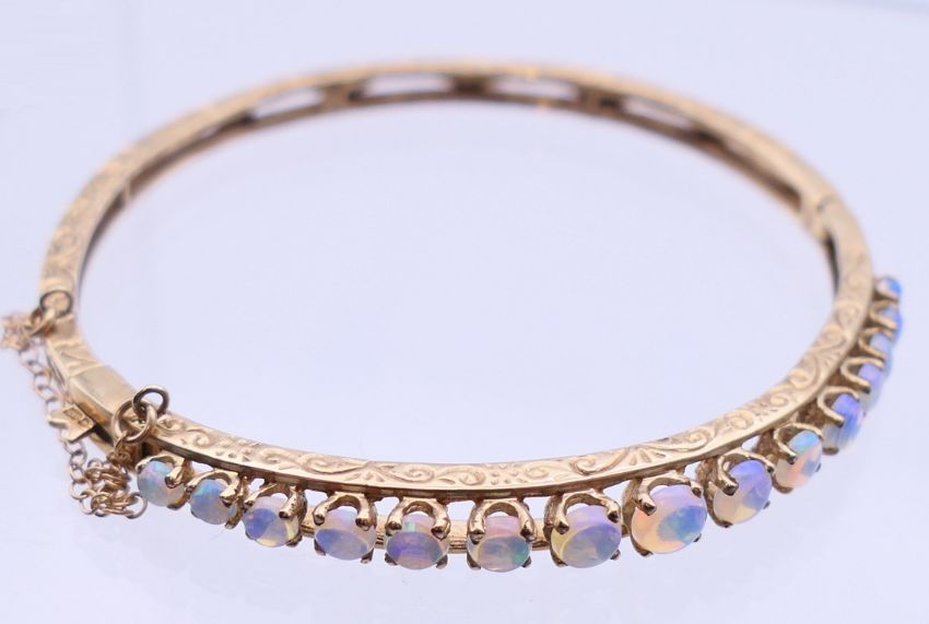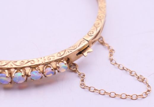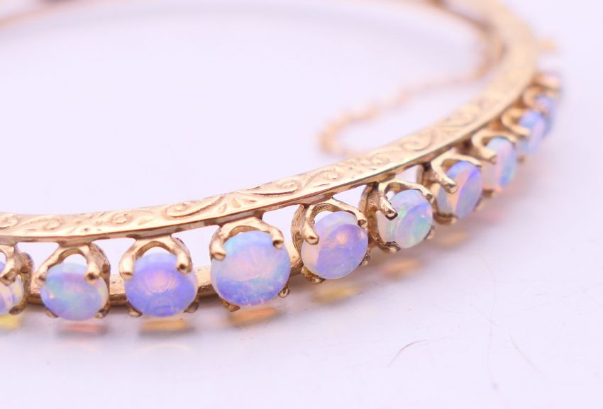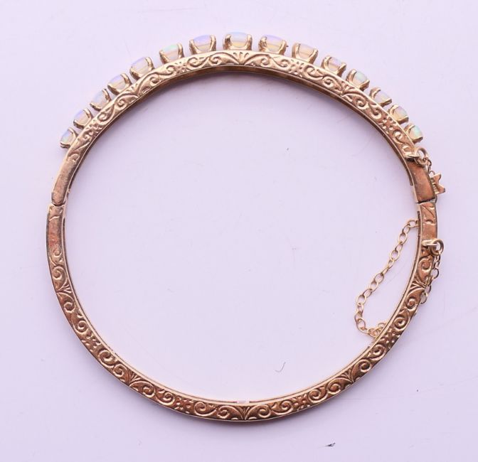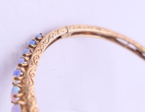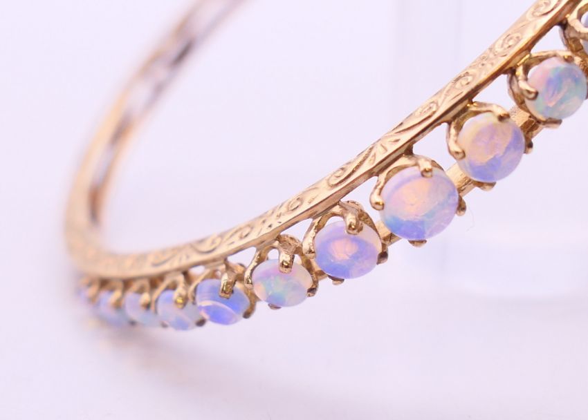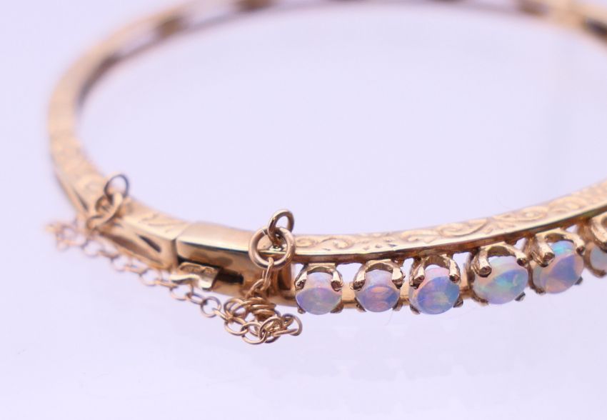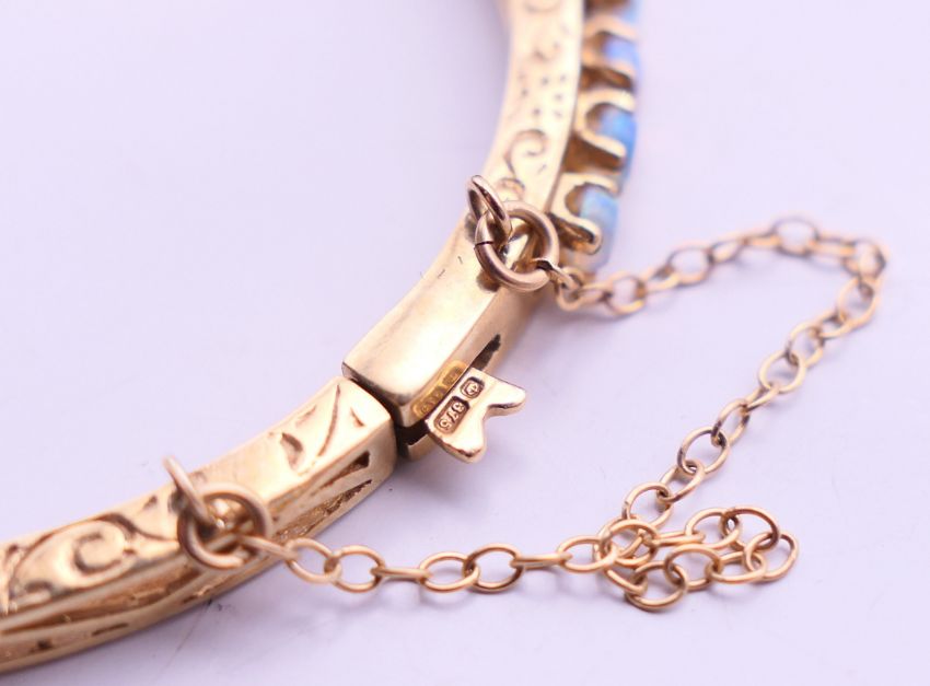 A 9 ct gold opal bangle bracelet. 6 cm diameter. 10.9 grammes total weight.