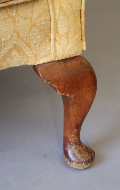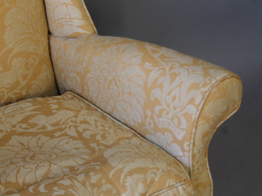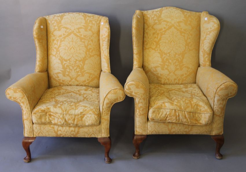 Two early 20th century upholstered wingback armchairs. The larger 81 cm wide.