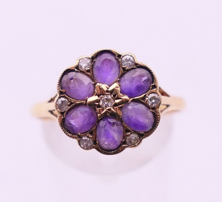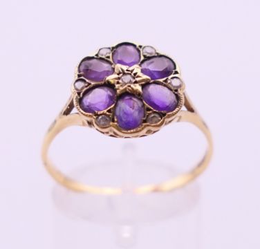 A 9 ct gold, amethyst and diamond cluster ring. Ring size U.