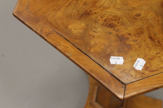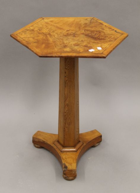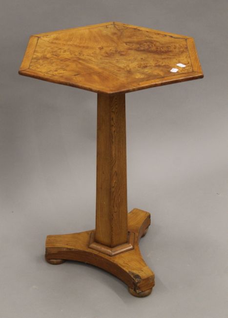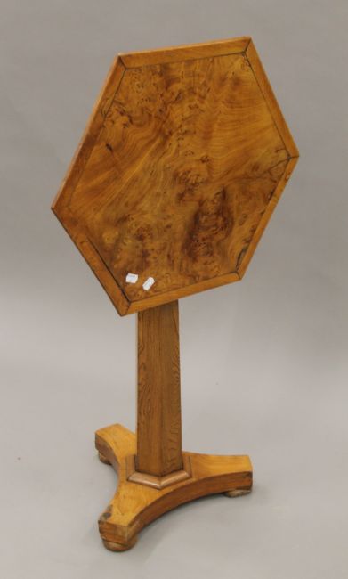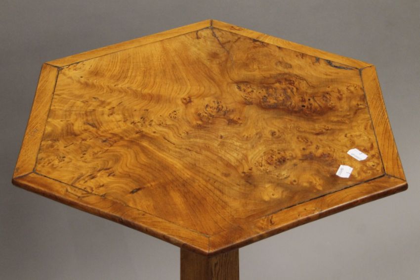 A 19th century burr elm hexagonal tilt-top tripod table. 59 cm wide.