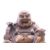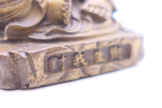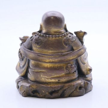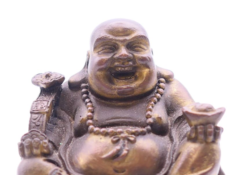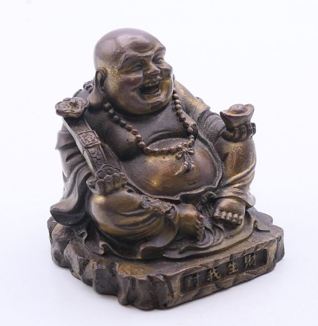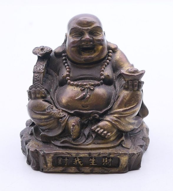 A small Chinese bronze figure of Hotei, god of fortune, seated with ruyi sceptre in one hand and an ingot in the other, with traces of gilding. 6 cm high.