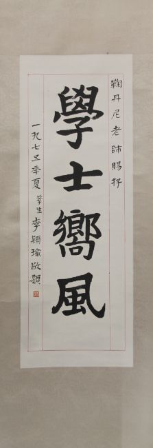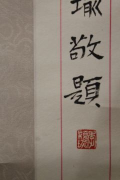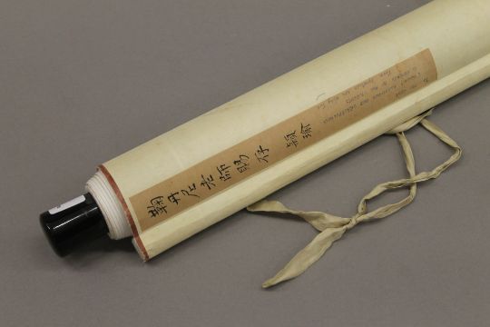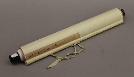 A paper scroll on a roller with a column of Chinese calligraphy in ink. 166 x 41 cm.