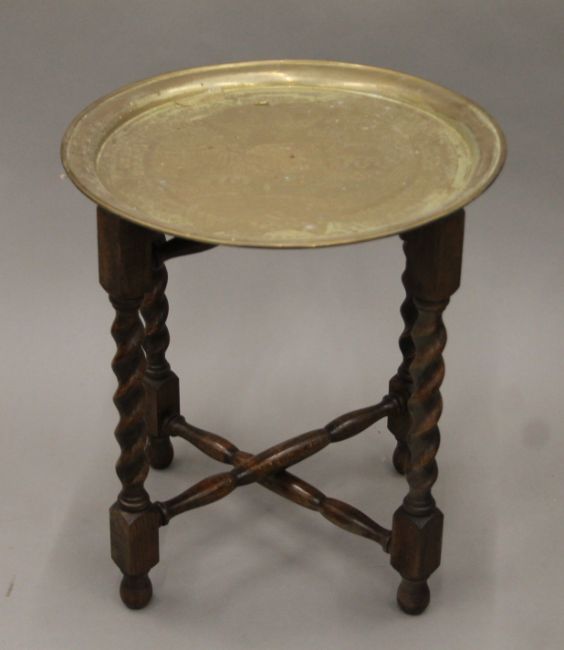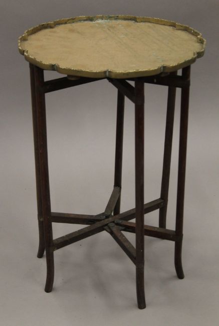 An early 20th century Chinese brass-topped folding table and another Eastern example. The former 34.5 cm diameter.