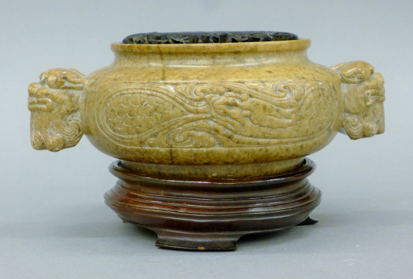 A 19th/20th century Chinese stone (possibly Shoushan) carved with dog-of-fo handles and dragon side panels with reticulated hardwood cover and hardwood stand. 18 cm wide.