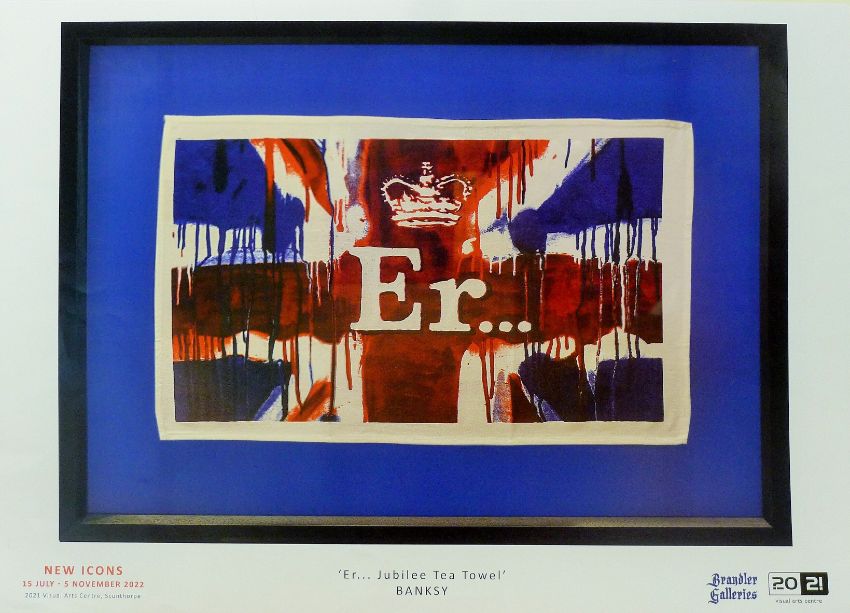 BANKSY, After (born 1974) British, "Er........ Jubilee Tea Towel", a printed poster to promote the New Icons Exhibition held at the 2021 Visual Arts Centre, Scunthorpe, unframed. 50 x 70 cm overall.