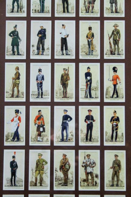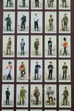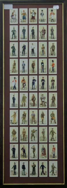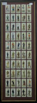 A reprinted set of Player's cigarette cards of British Military Uniforms, framed and glazed. 30 x 82.5 cm.
