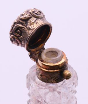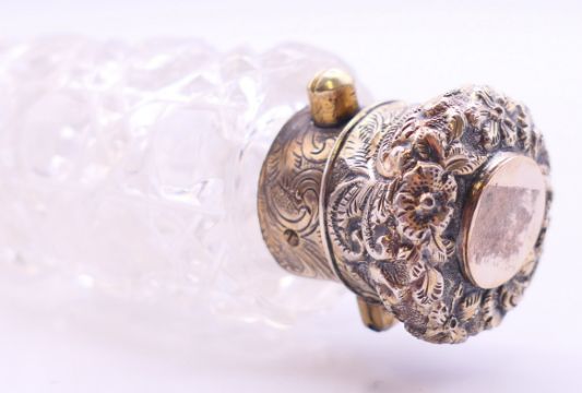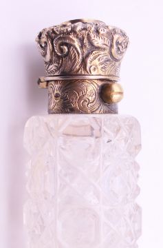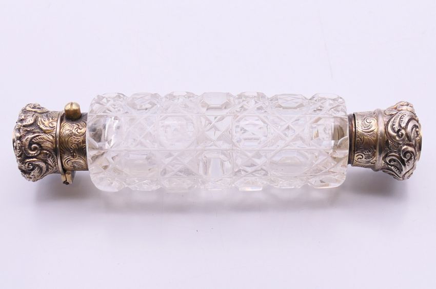 A Victorian double-ended cut glass scent bottle with silver tops. 12 cm high.