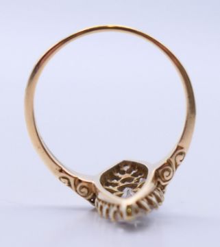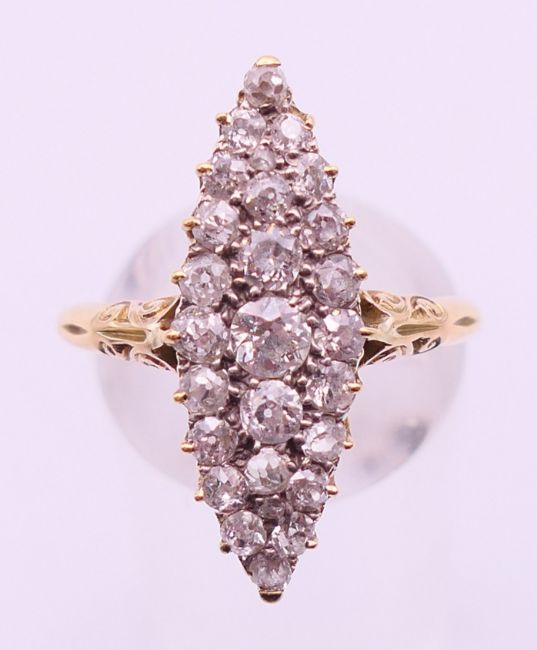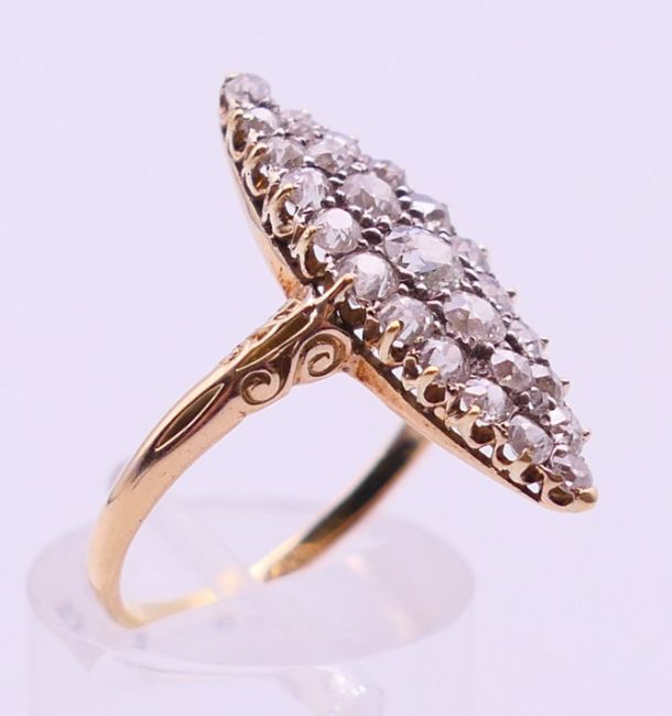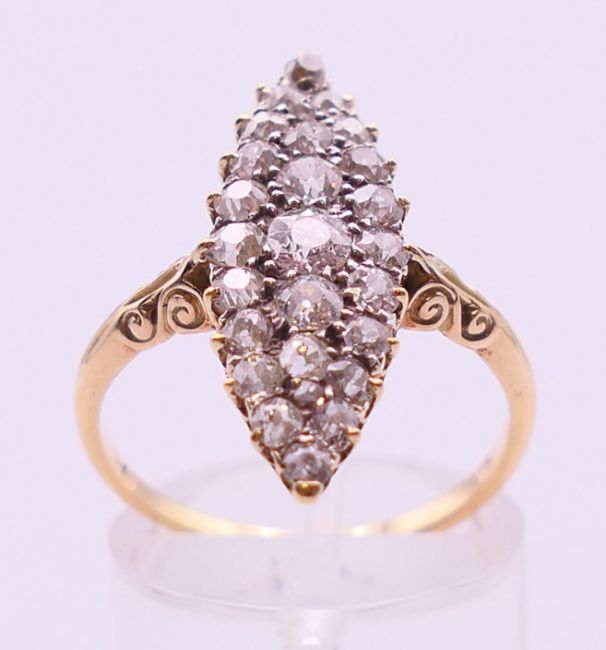 An unmarked gold diamond navette ring. Ring size Q.