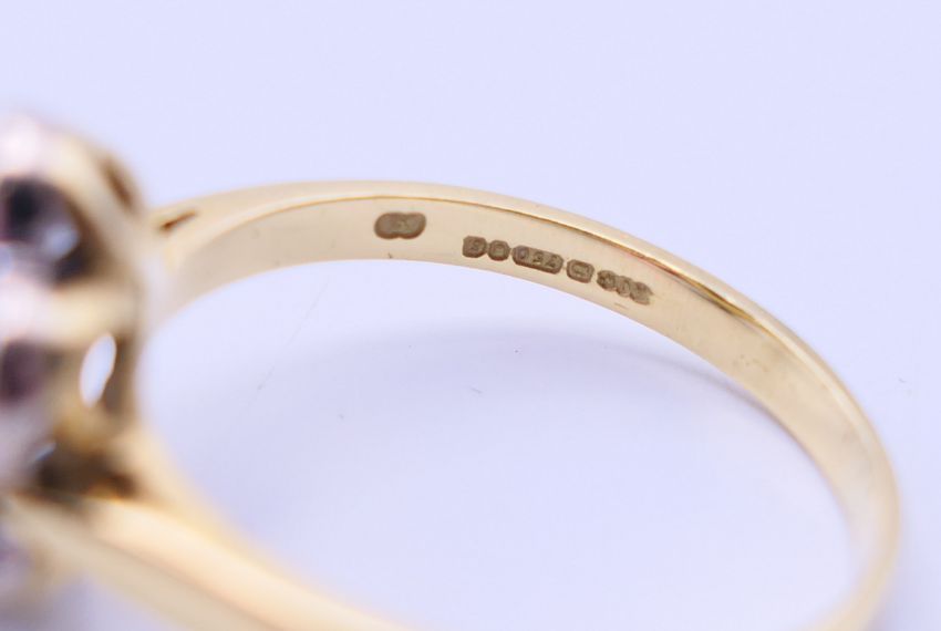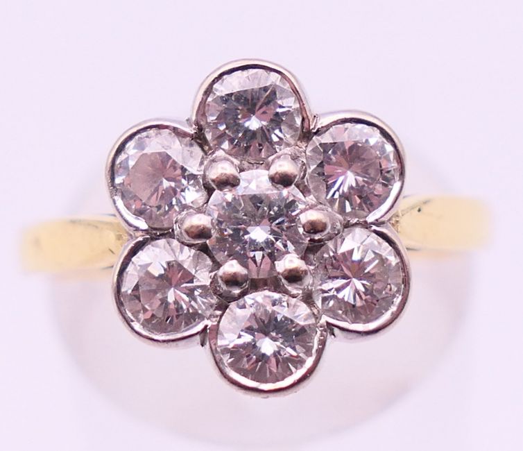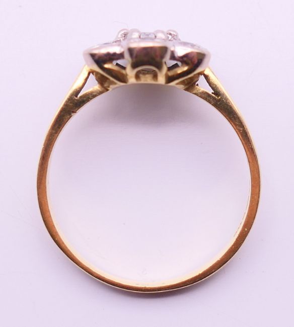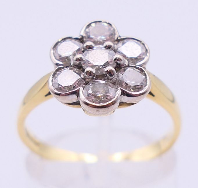 An 18 ct gold diamond flower head ring. Ring size P/Q.