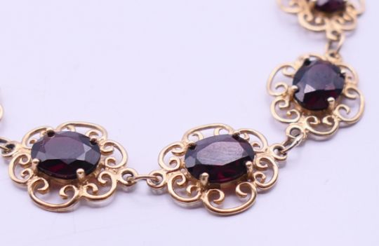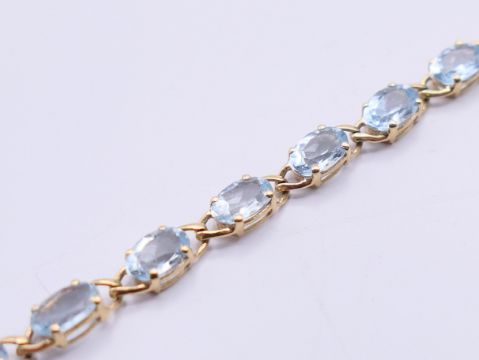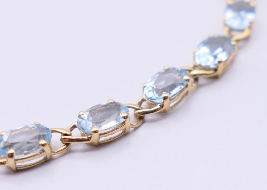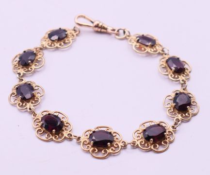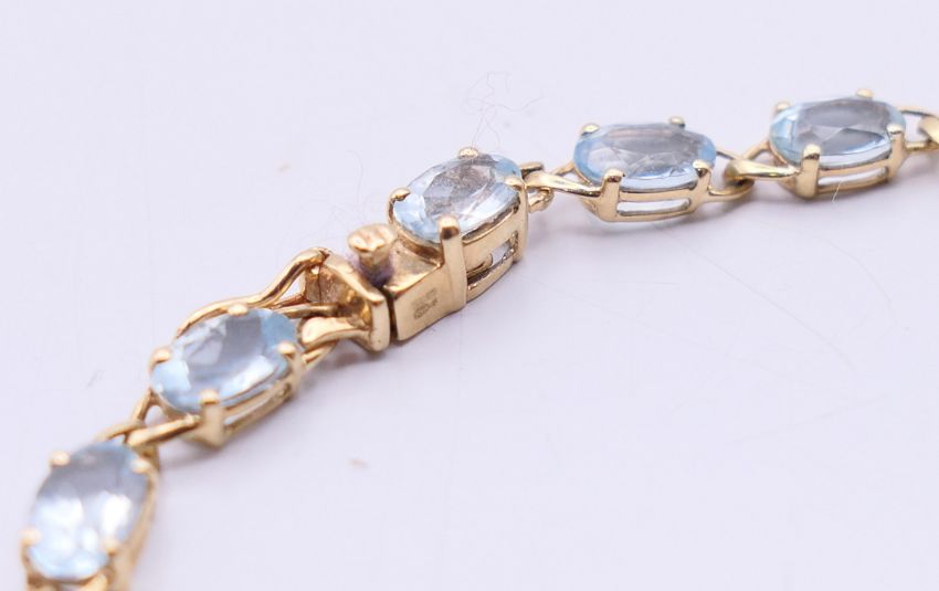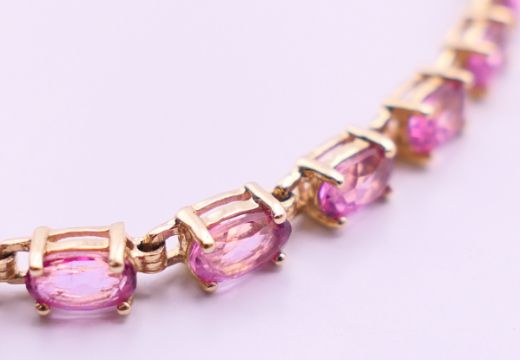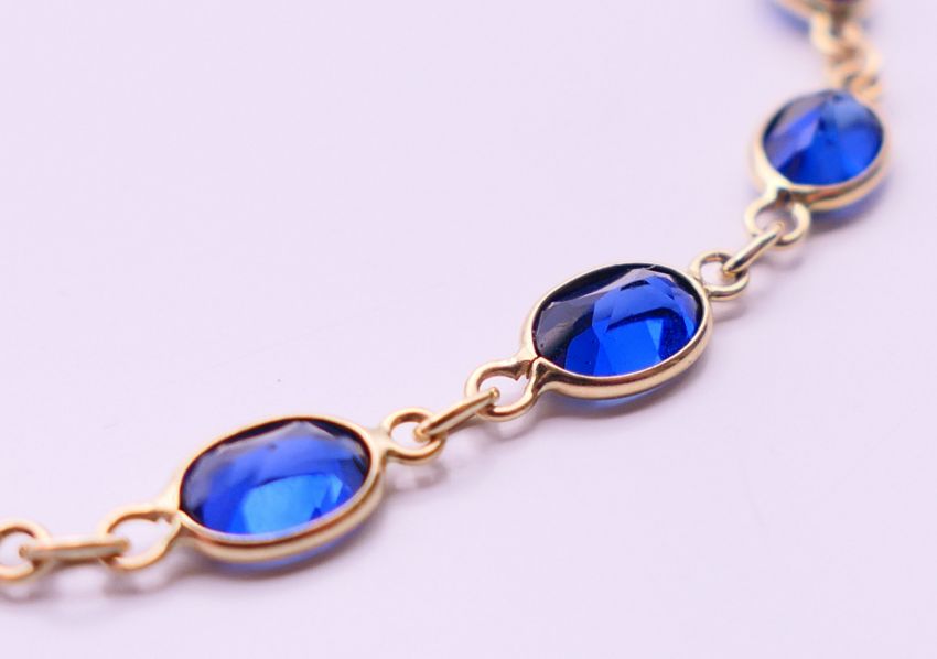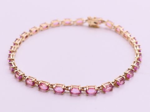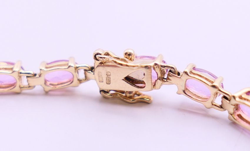 A quantity of stone set 9 ct gold bracelets. Pink stone bracelet 18.5 cm long, dark blue stone bracelet 17.5 cm long. 50 grammes total weight.