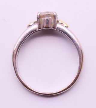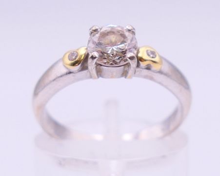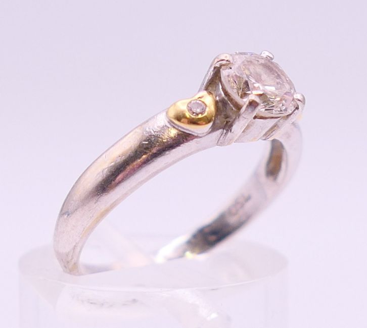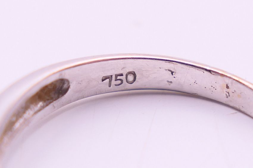 An 18 ct white gold three stone diamond ring. Ring size M.