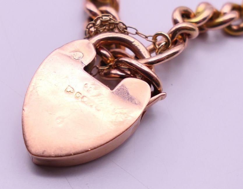 A quantity of 9 ct gold bracelets, to include a heart padlock bracelet. Each approximately 18.5 cm long. 113.4 grammes total weight.