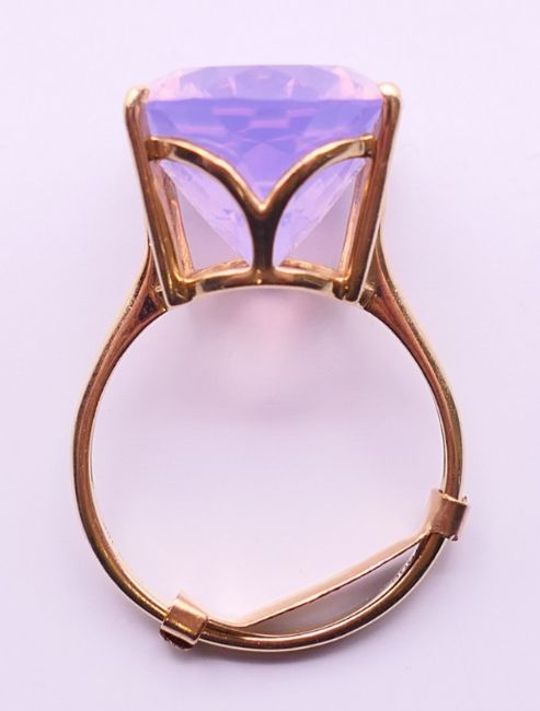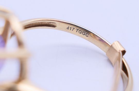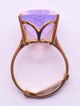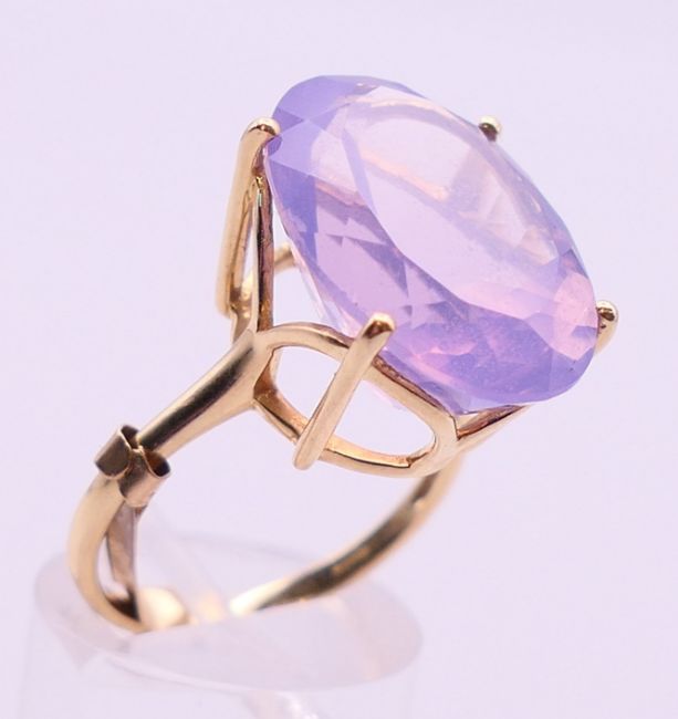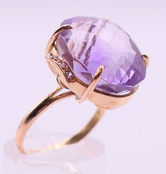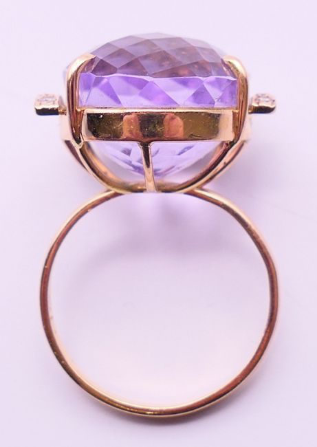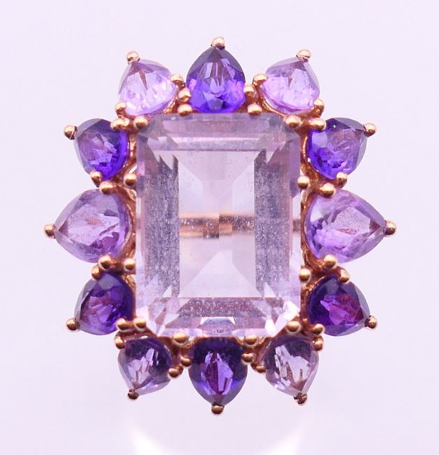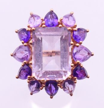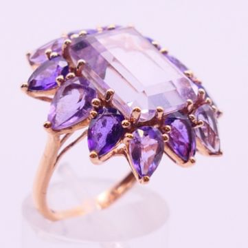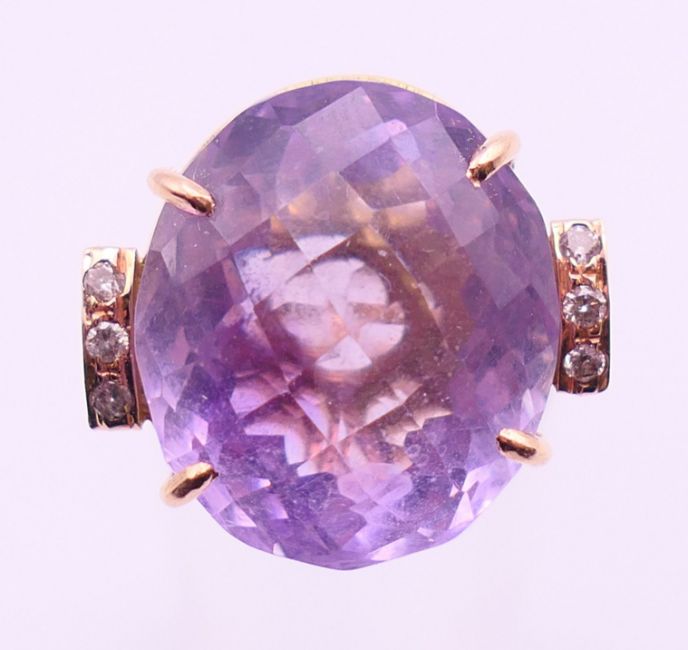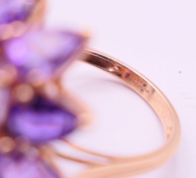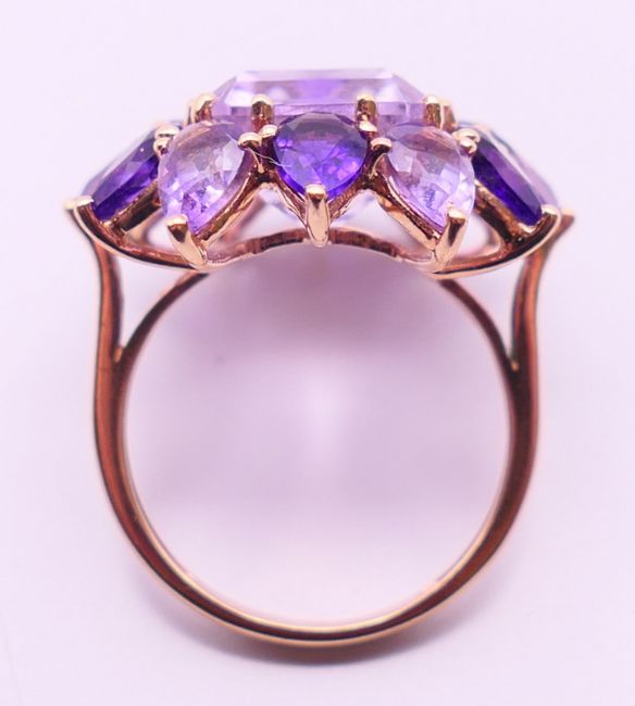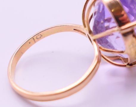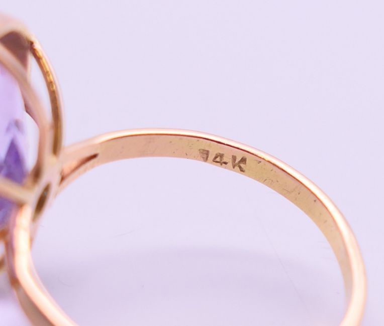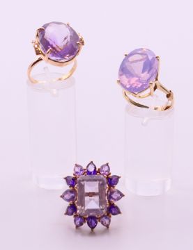 Two 9 ct gold and amethyst rings 13.4 grammes total weight and a 14 ct gold and amethyst ring 8.1 grammes total weight.