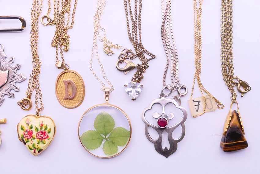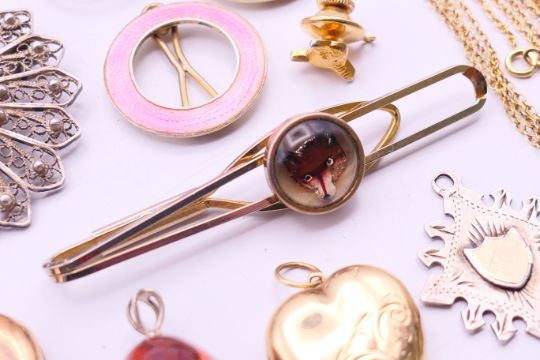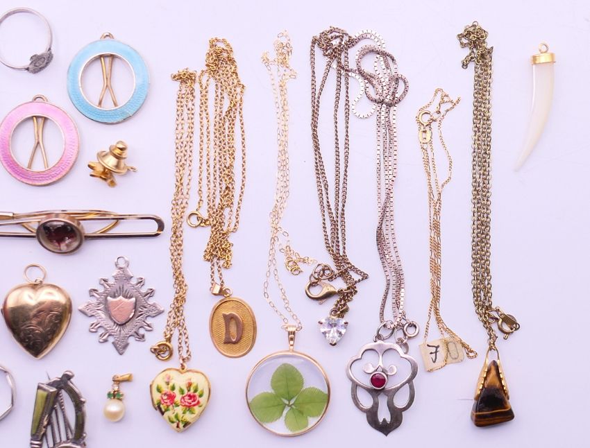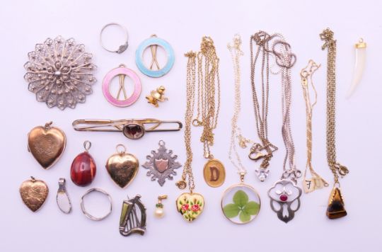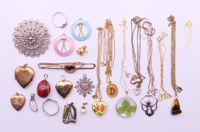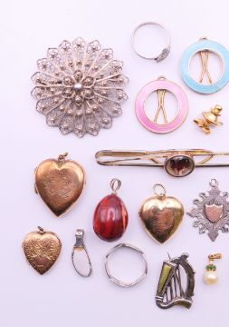 A quantity of miscellaneous jewellery, to include a 9 ct gold heart locket, a rolled gold heart locket and two 9 ct gold back and front heart lockets, a 9 ct gold chain, a 9 ct gold pearl pendant, two silver and enamel hair pins, two silver rings, two silver pendants, a filigree brooch, etc. Filigree brooch 4.75 cm diameter.