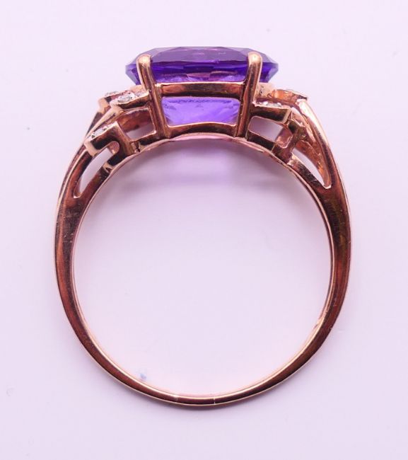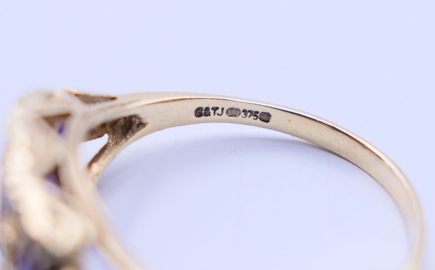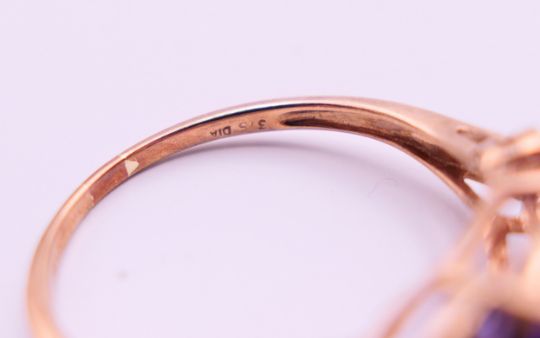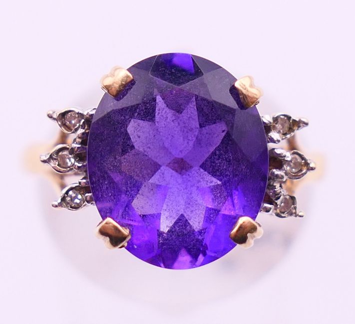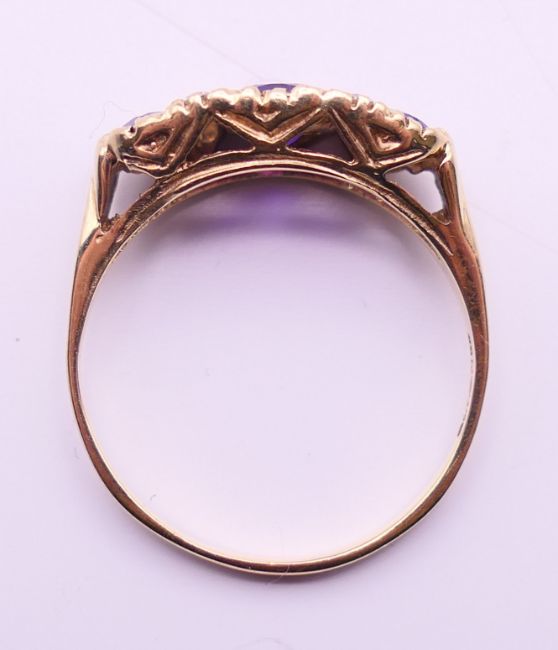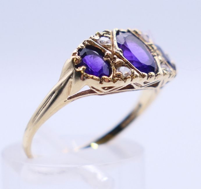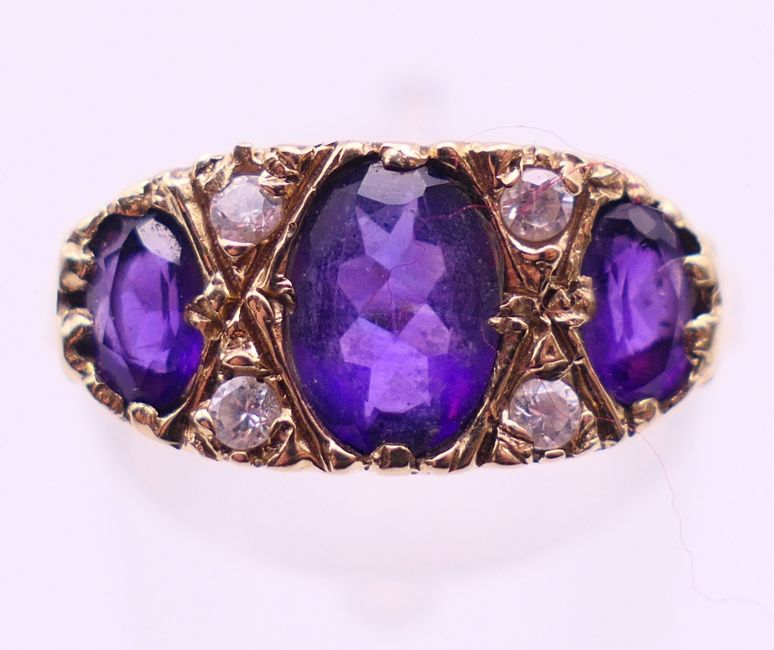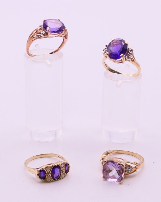Four 9 ct gold diamond and amethyst rings. 12.5 grammes total weight.