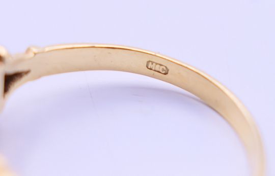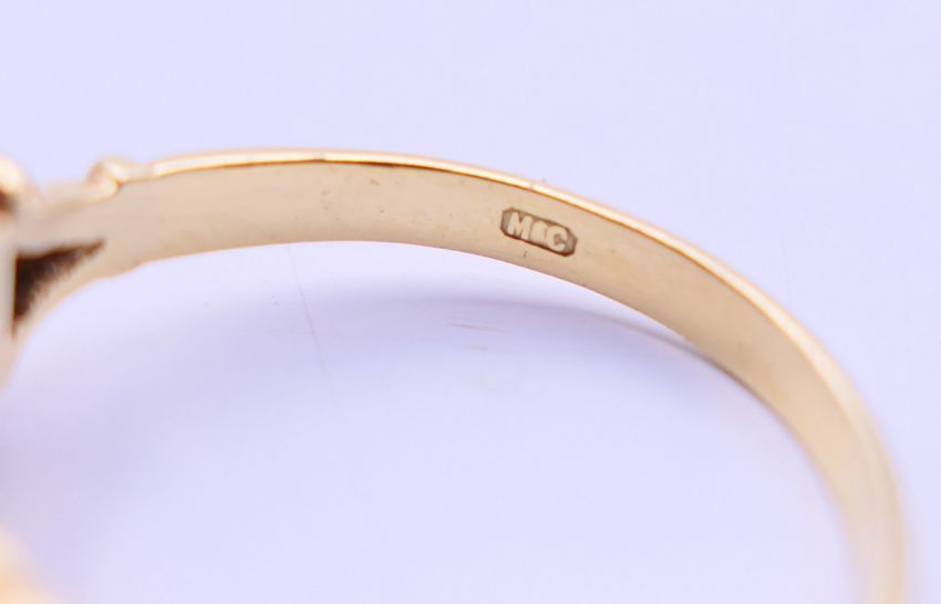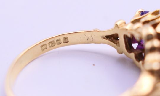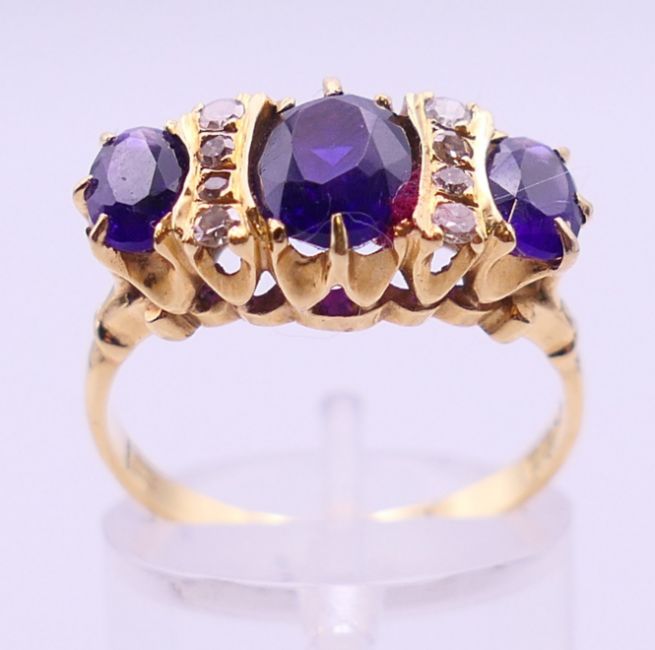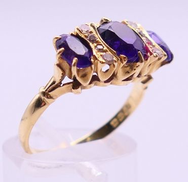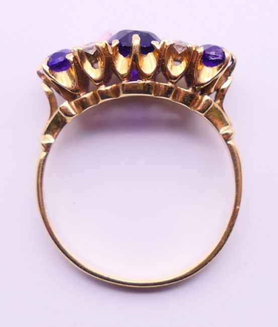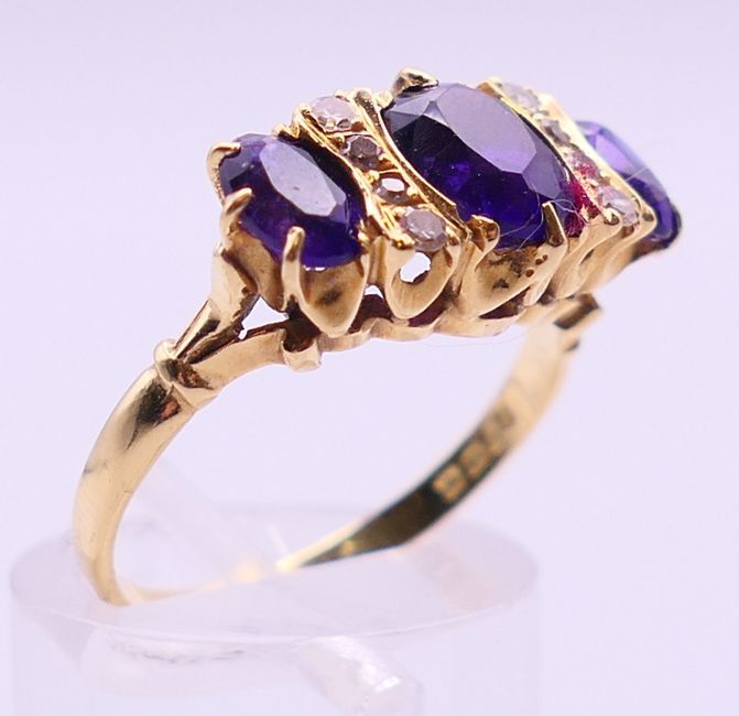 An 18 ct gold, diamond and amethyst ring. Ring size O/P.