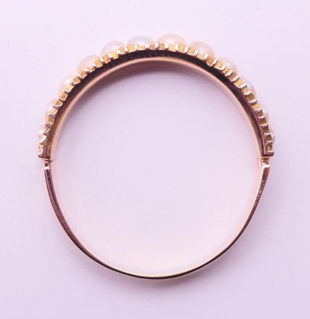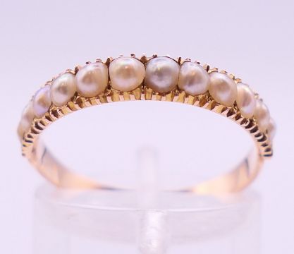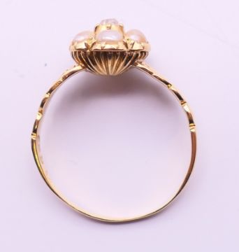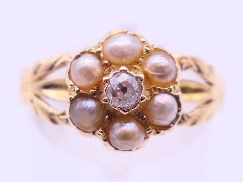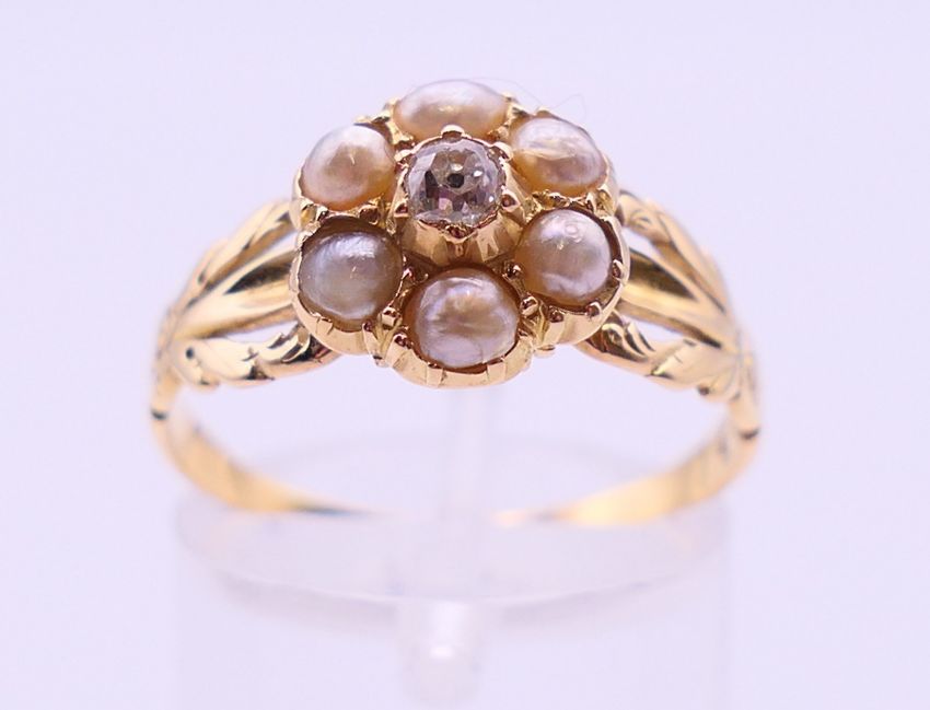 An unmarked gold, diamond and seed pearl ring, and another unmarked gold and seed pearl ring. Ring size each O/P.