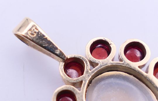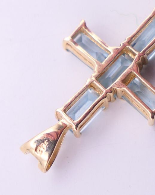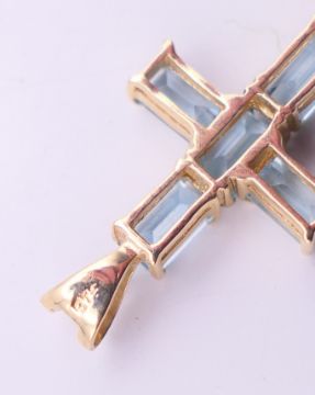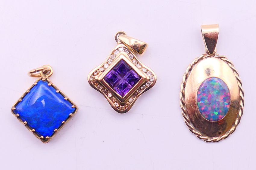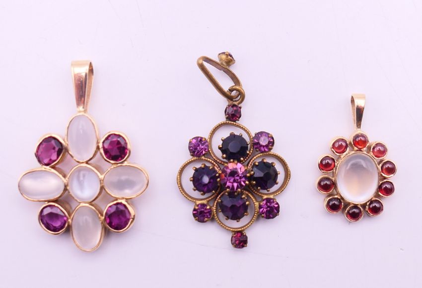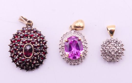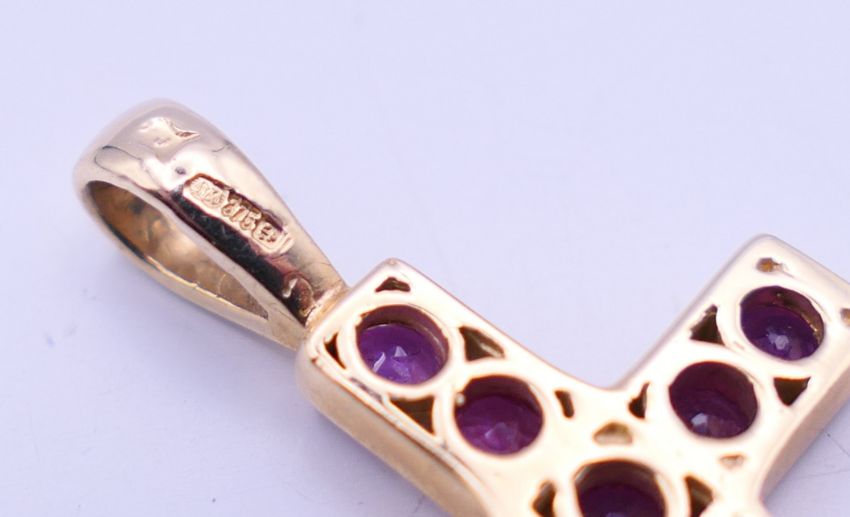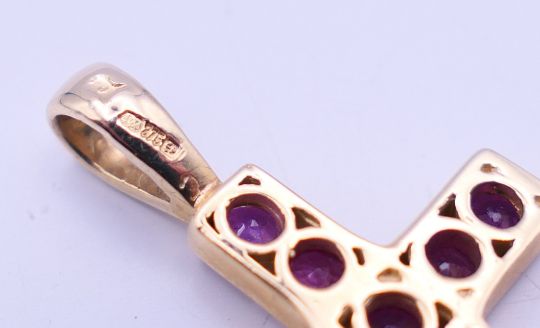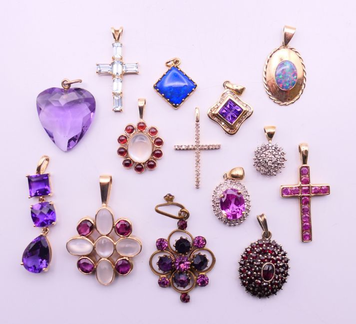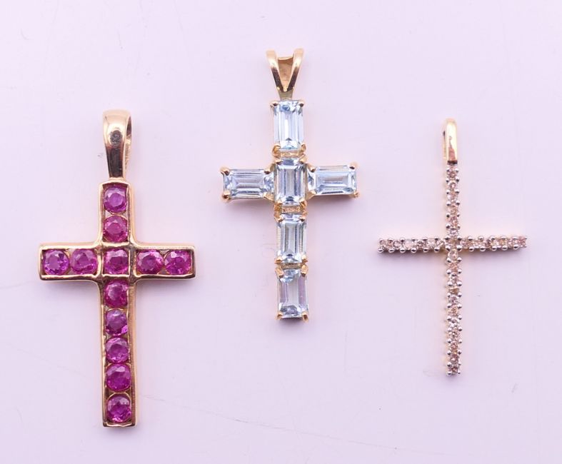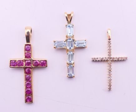 A quantity of various gold gem set pendants to include three 9 ct gold gem set cross pendants. Largest cross pendant 3.25 cm high.