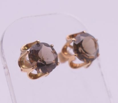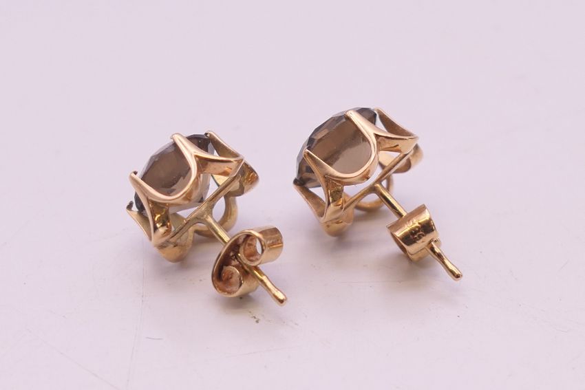 A pair of 14 ct gold and smoky quartz ear studs. 1 cm diameter. 2.5 grammes total weight.