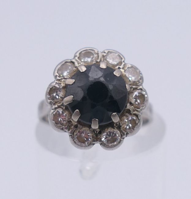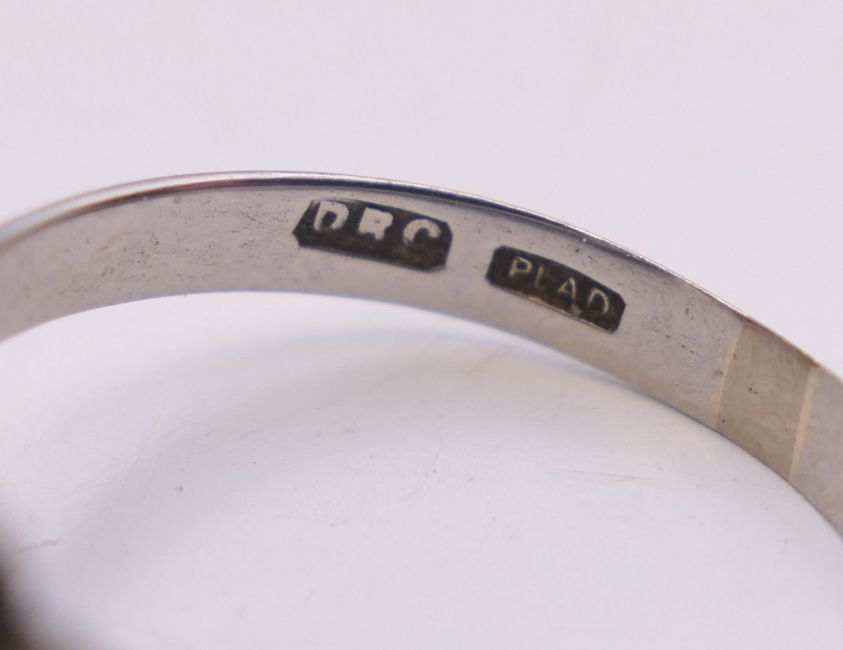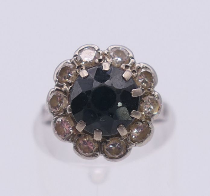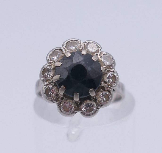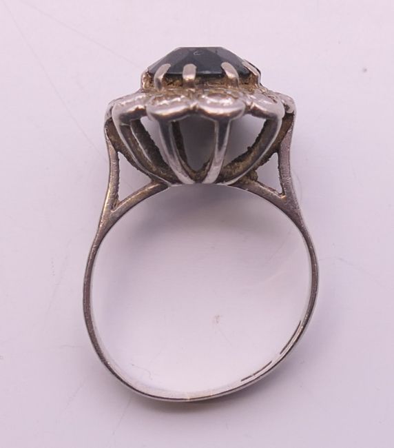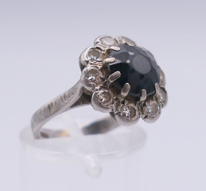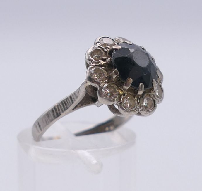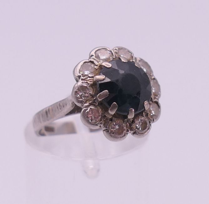 A platinum diamond and sapphire ring. Ring size H.
