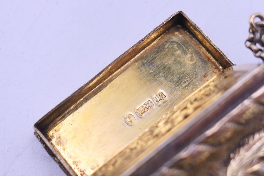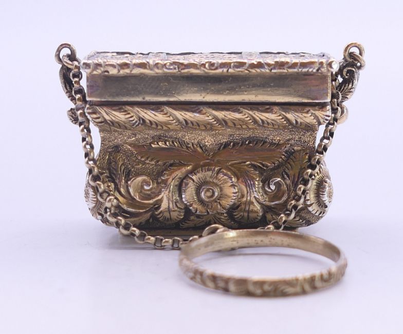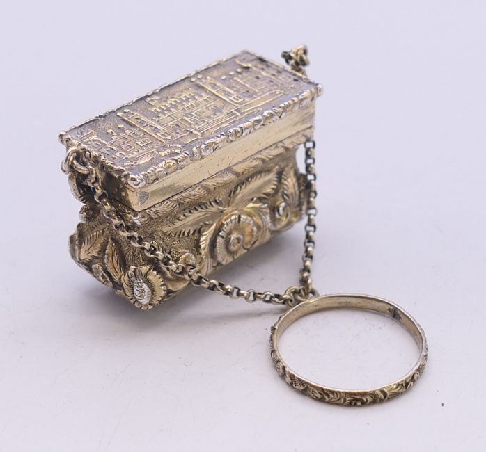 A Victorian silver gilt castle top basket form vinaigrette. 2.25 cm high.
