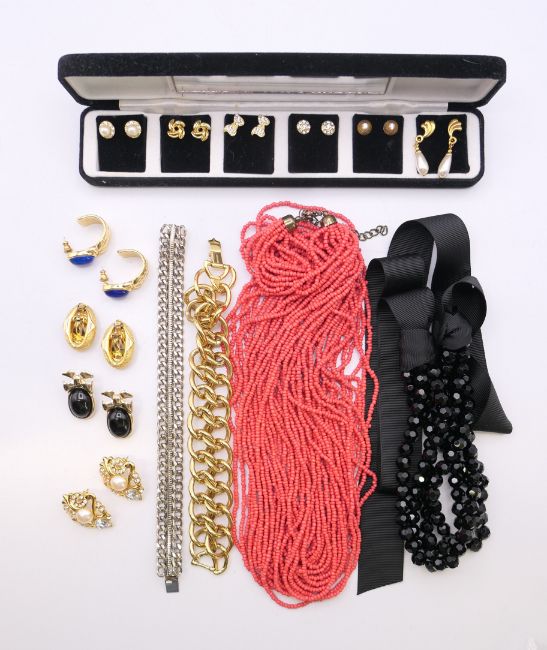 A quantity of designer jewellery, to include a box of Pierre Cardin earrings, a pair of Monet earrings, a Monet bracelet, a pair of Trifari earrings, a fourteen-strand coral necklace, a bracelet, a black bead choker necklace and two pair of earrings.