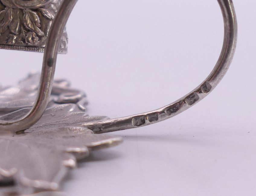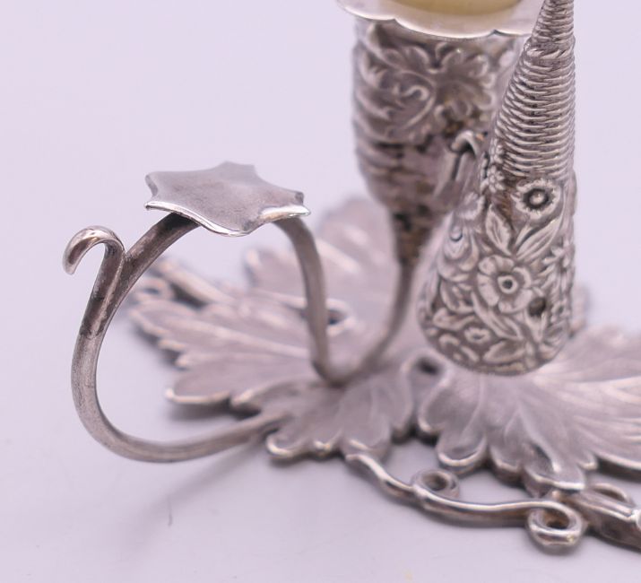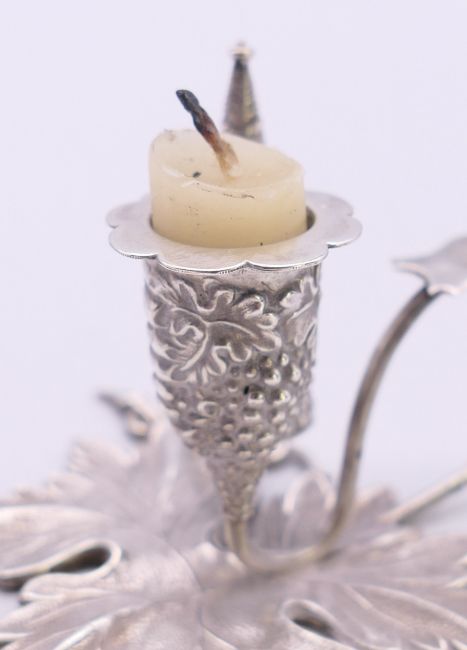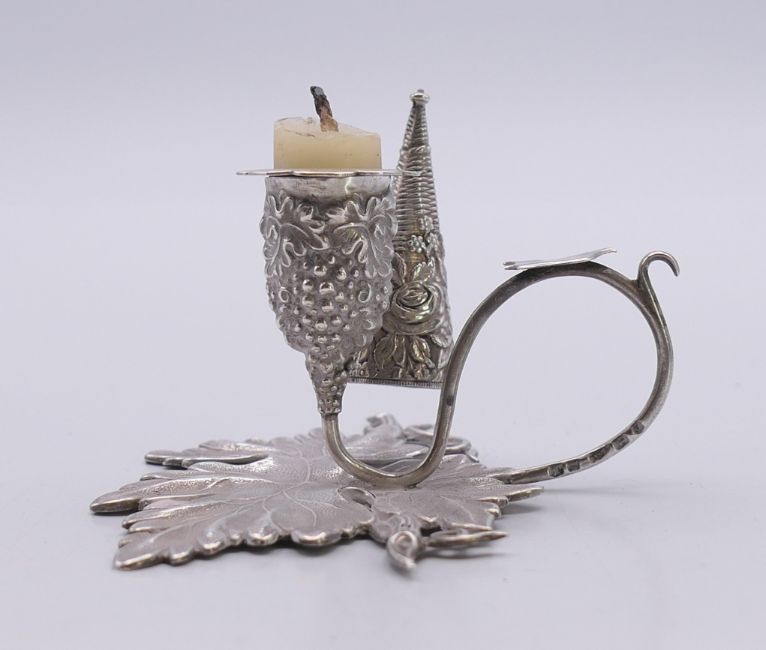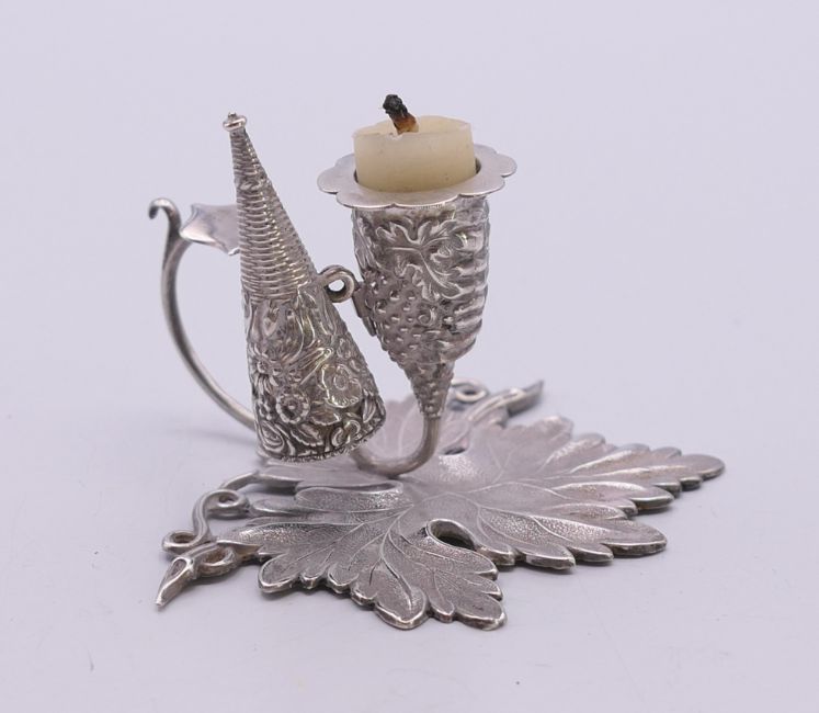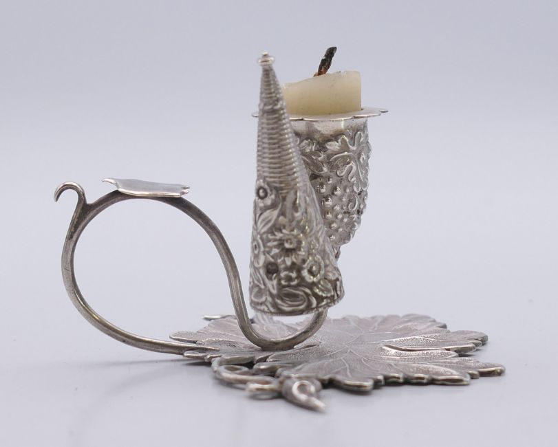 A small silver leaf shaped chamberstick and snuffer. 5 cm high.