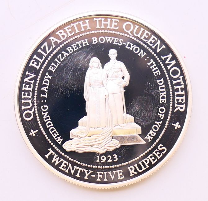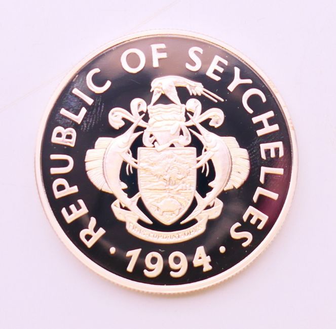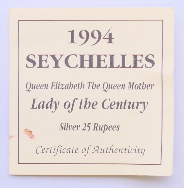 A 1994 Seychelles 25 rupees silver proof coin with certificate.