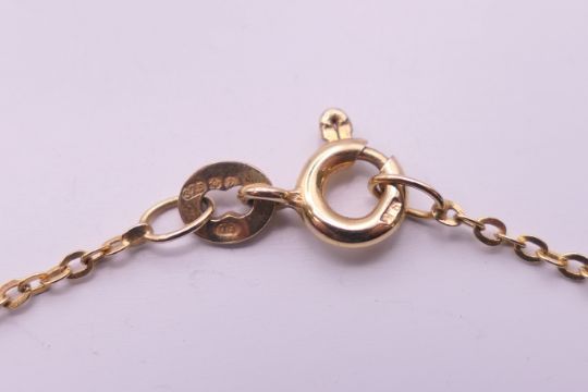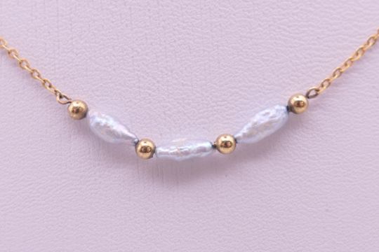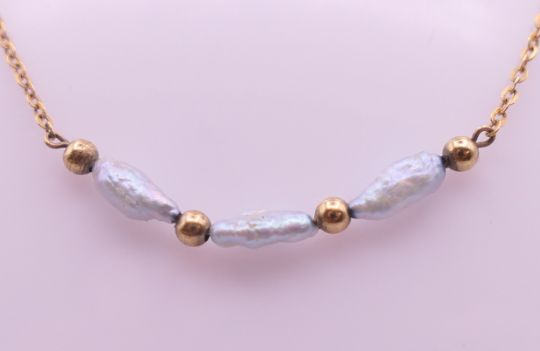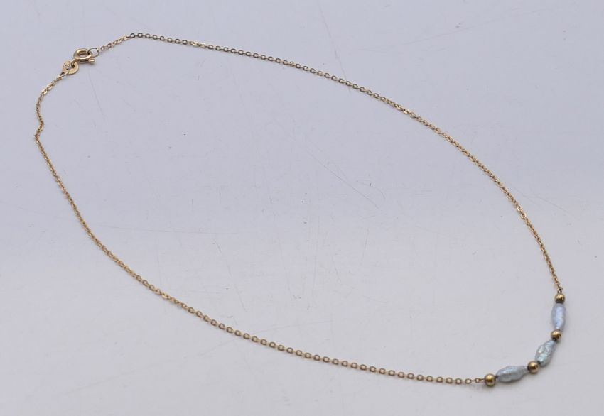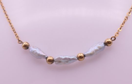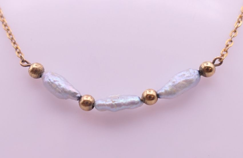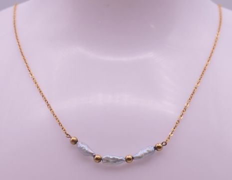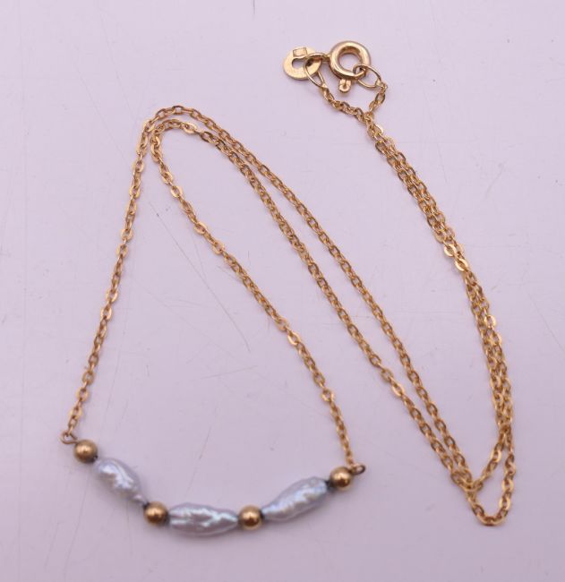 A 9 ct gold and pearl necklace. Approximately 40 cm long. 1.7 grammes total weight.