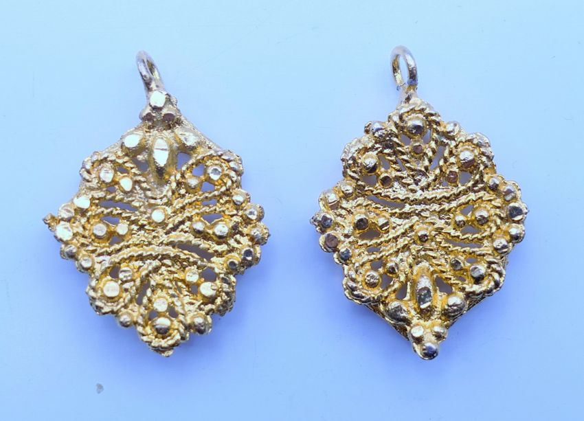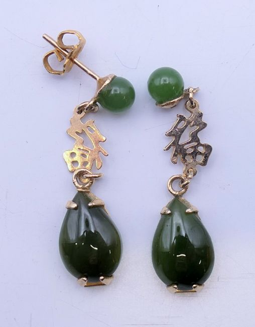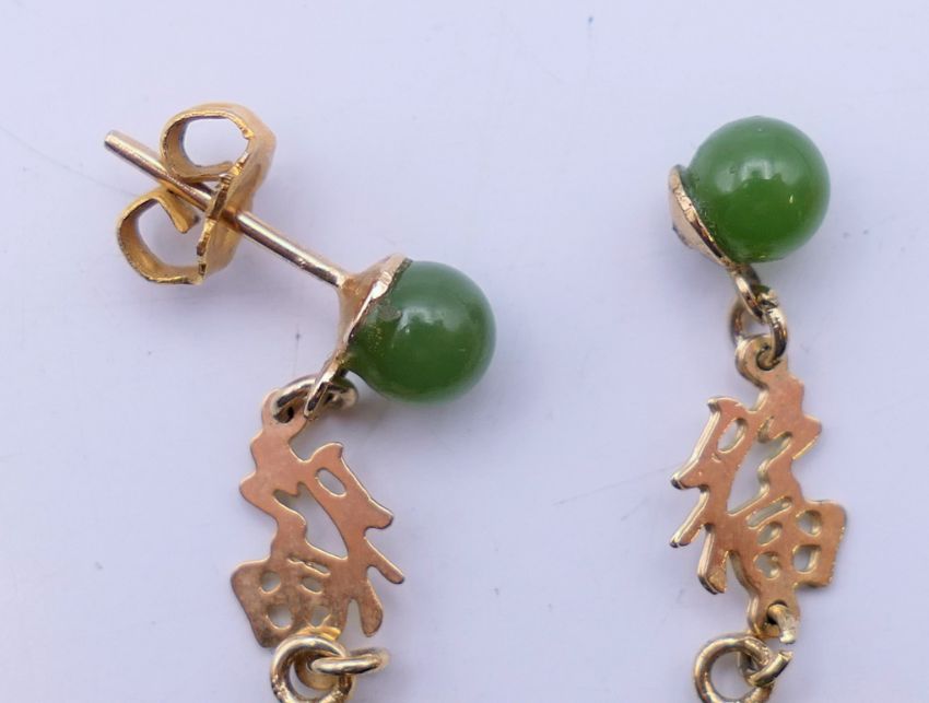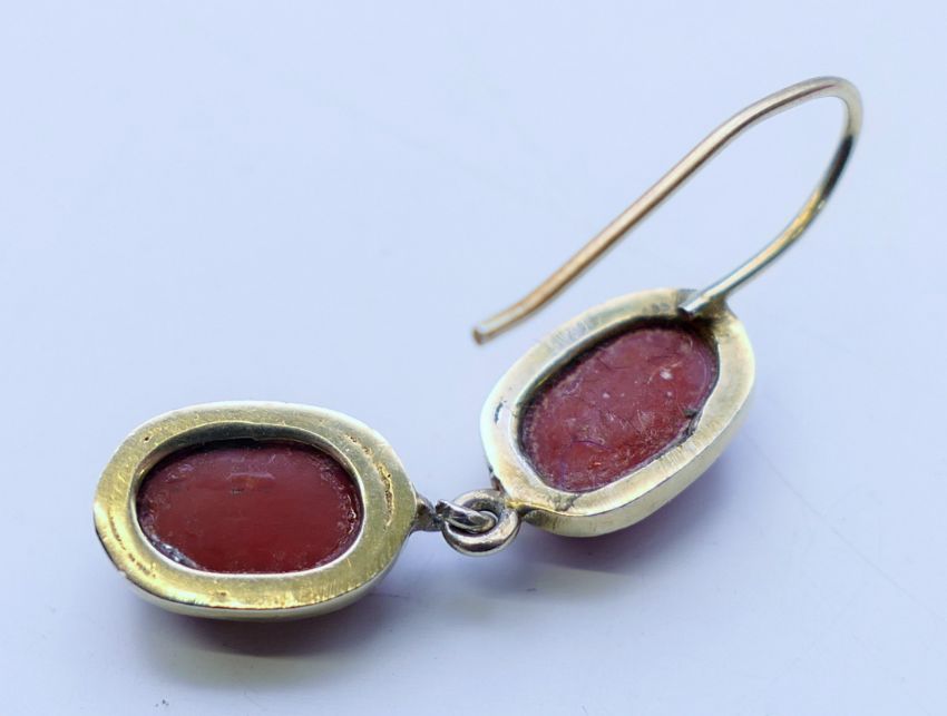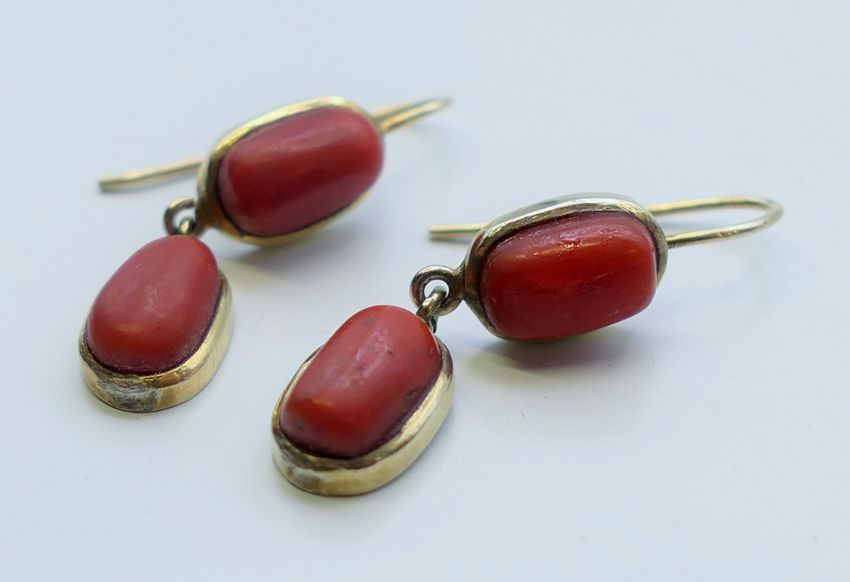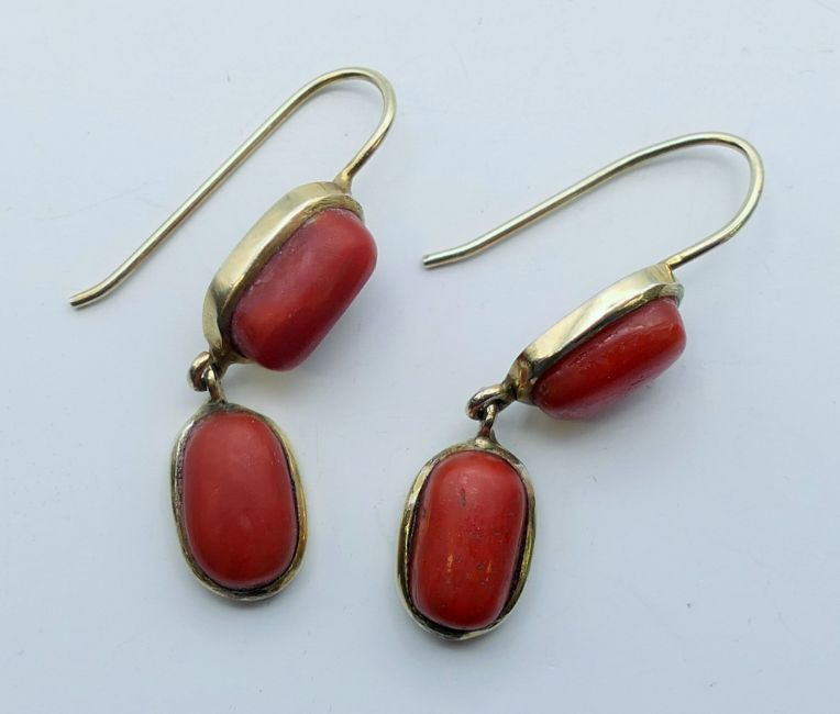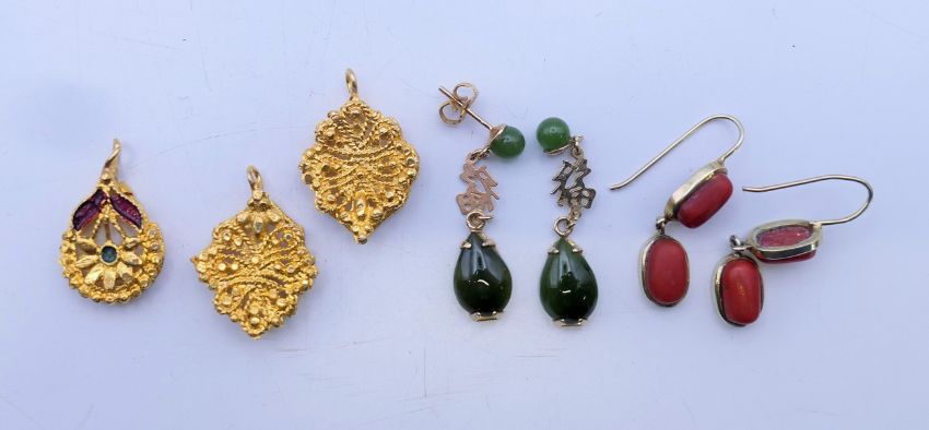 A pair of coral earrings, another pair of earrings and three pendants. Coral earrings 2.5 cm high.