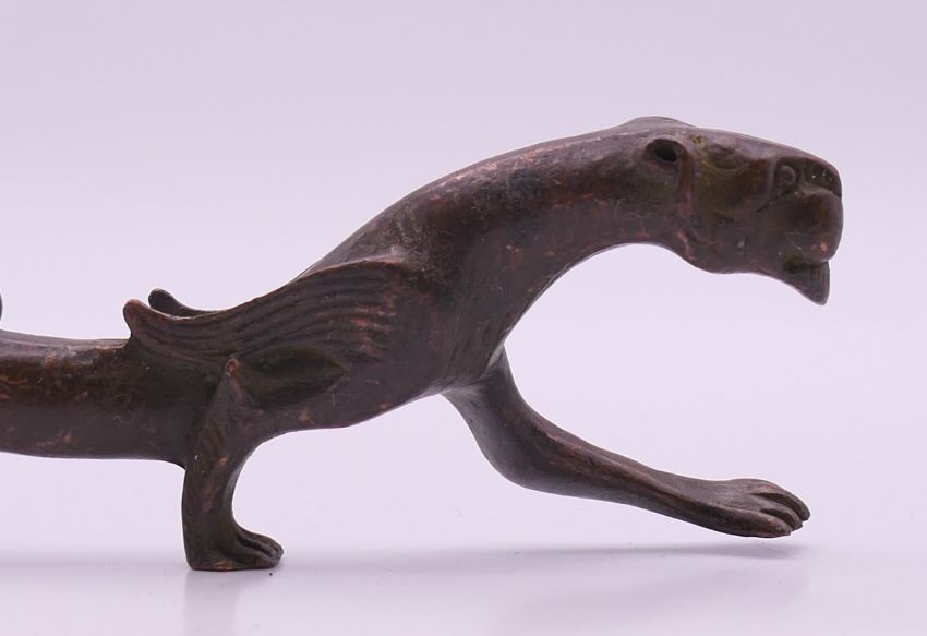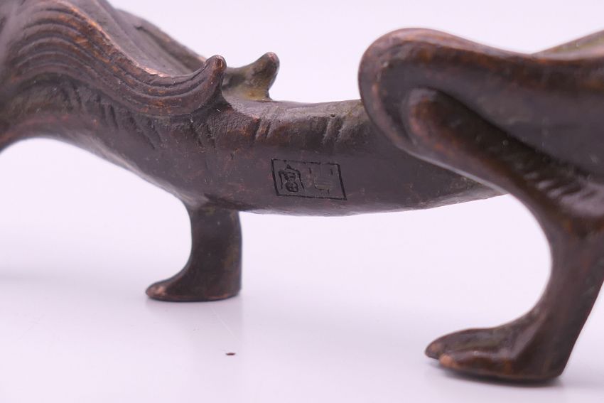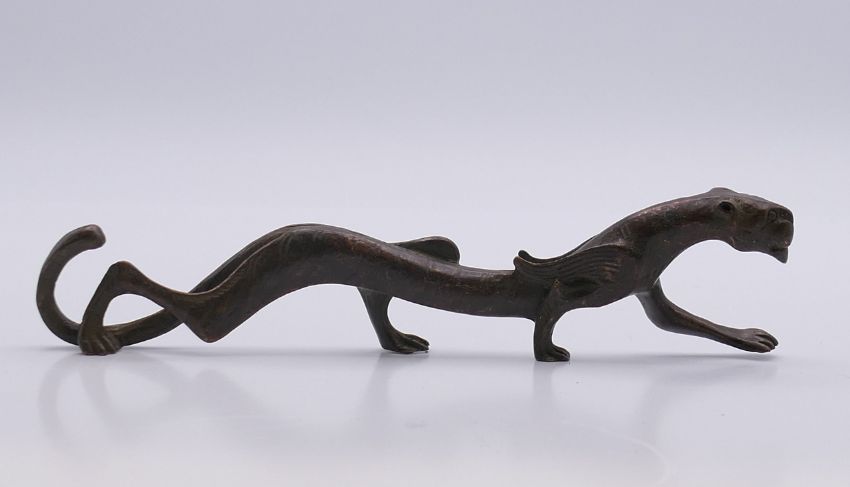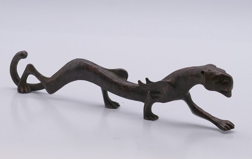 A bronze tiger scroll weight. 18 cm long.