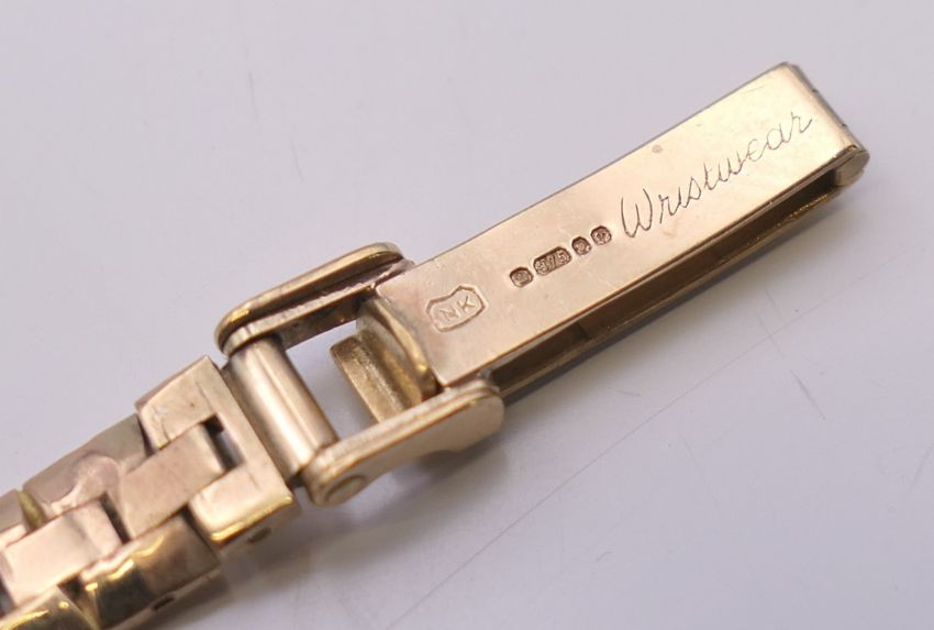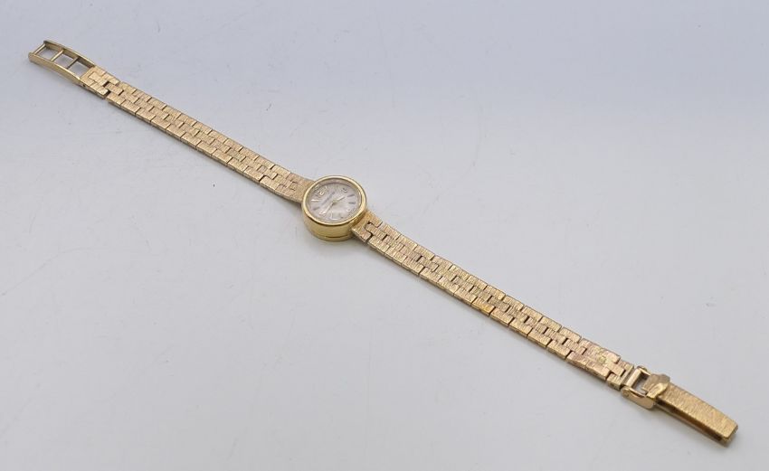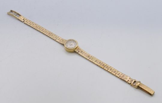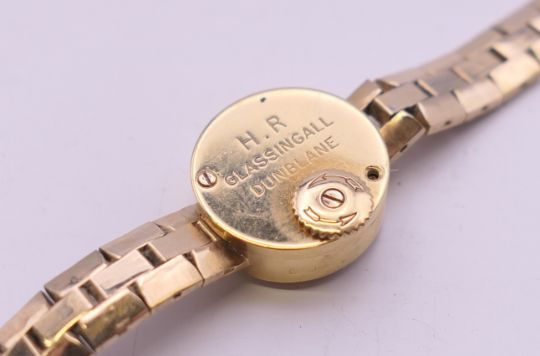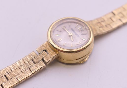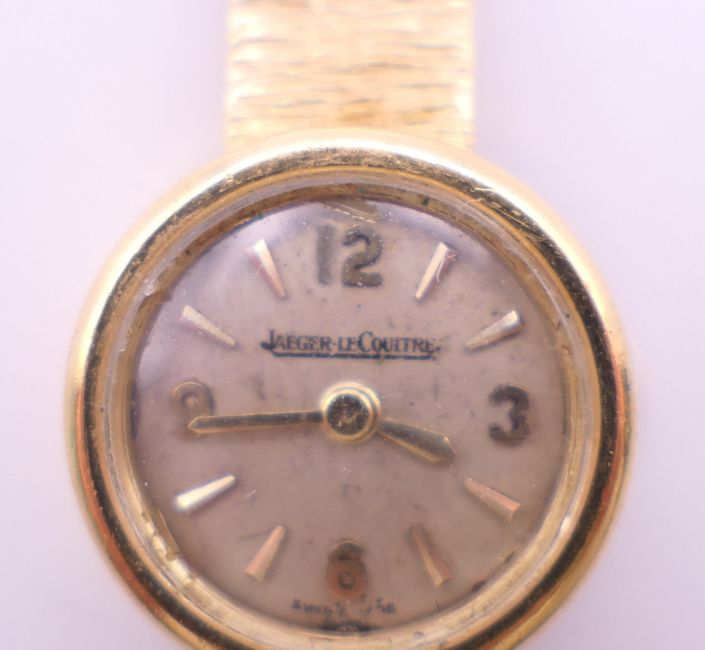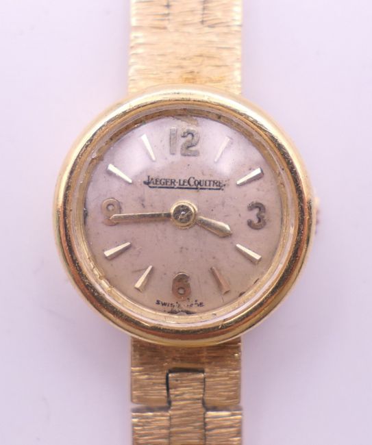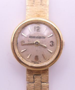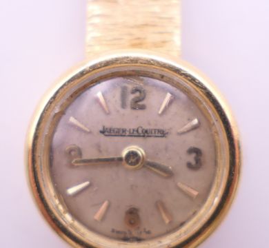 A 9 ct gold Jaeger-LeCoultre ladies' watch. 1.5 cm diameter. 18.4 grammes total weight.