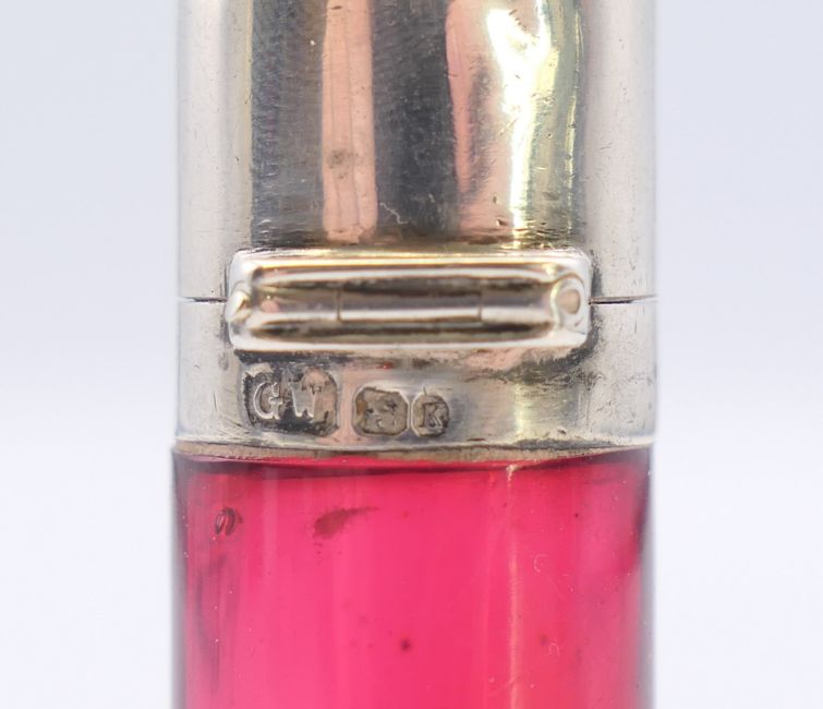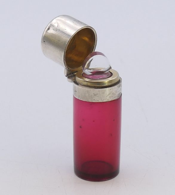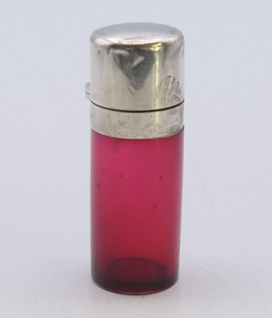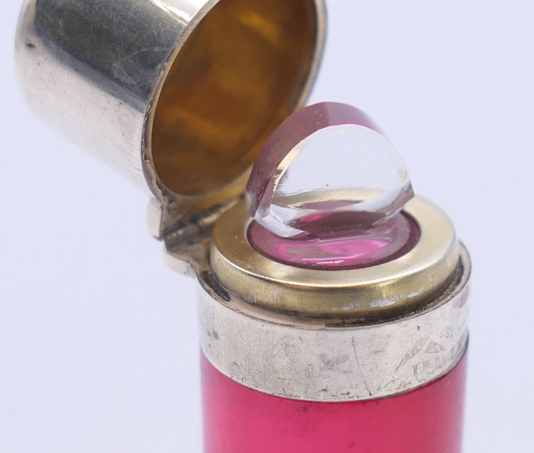 A cranberry glass and silver scent bottle with stopper. 5.5 cm high.