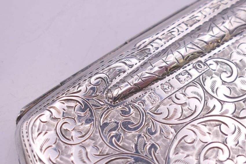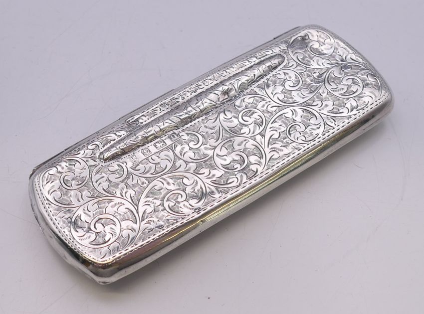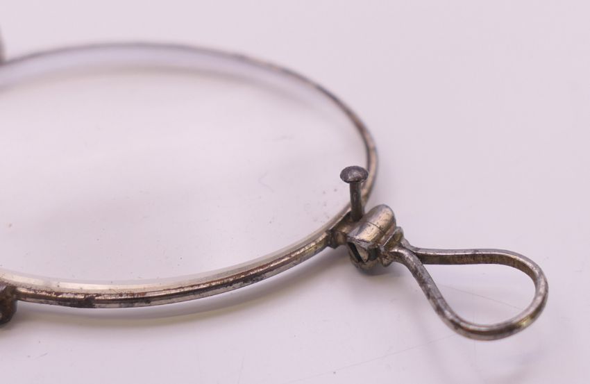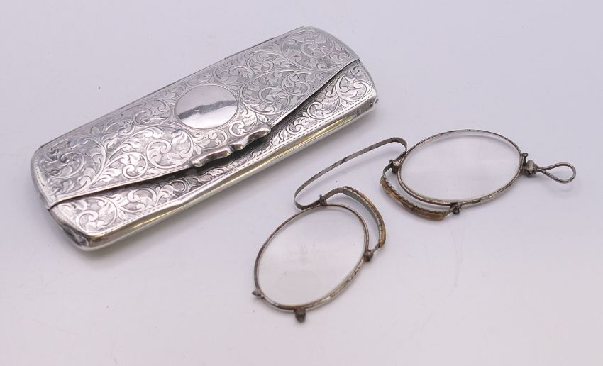 A pair of antique steel framed spectacles in a silver case. Case 11 cm x 4.5 cm.