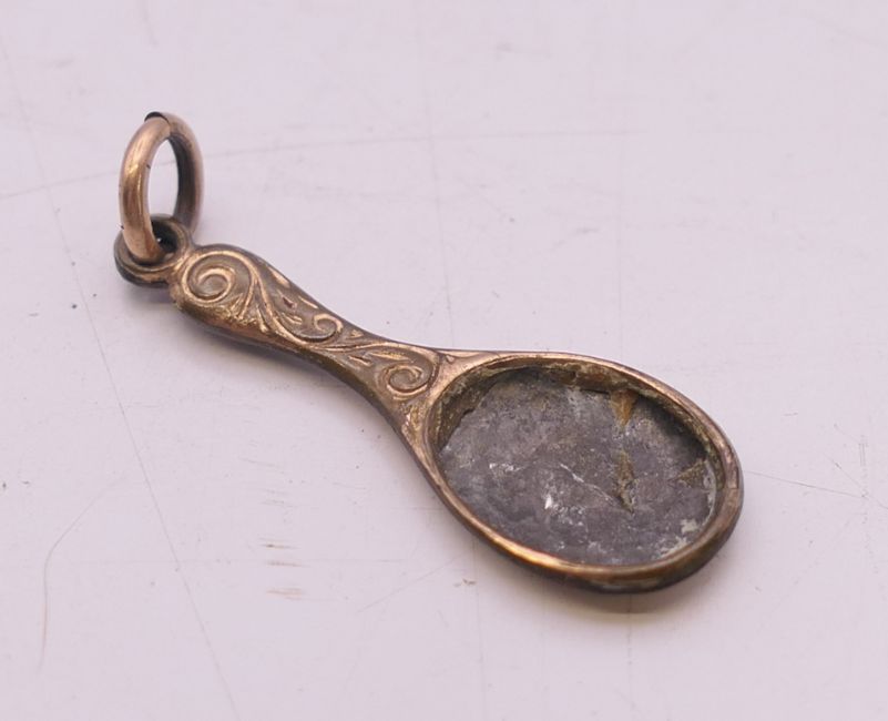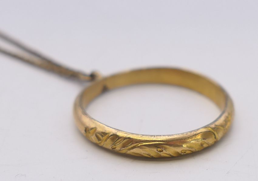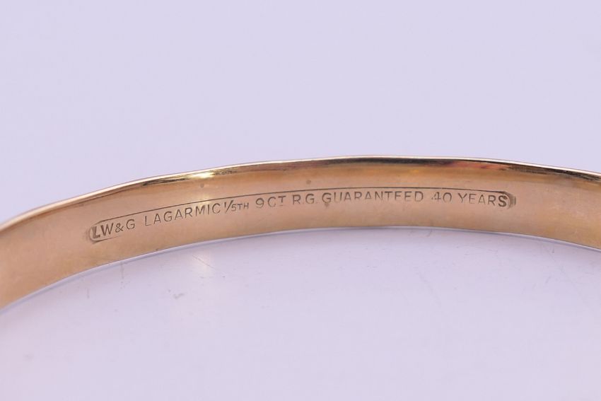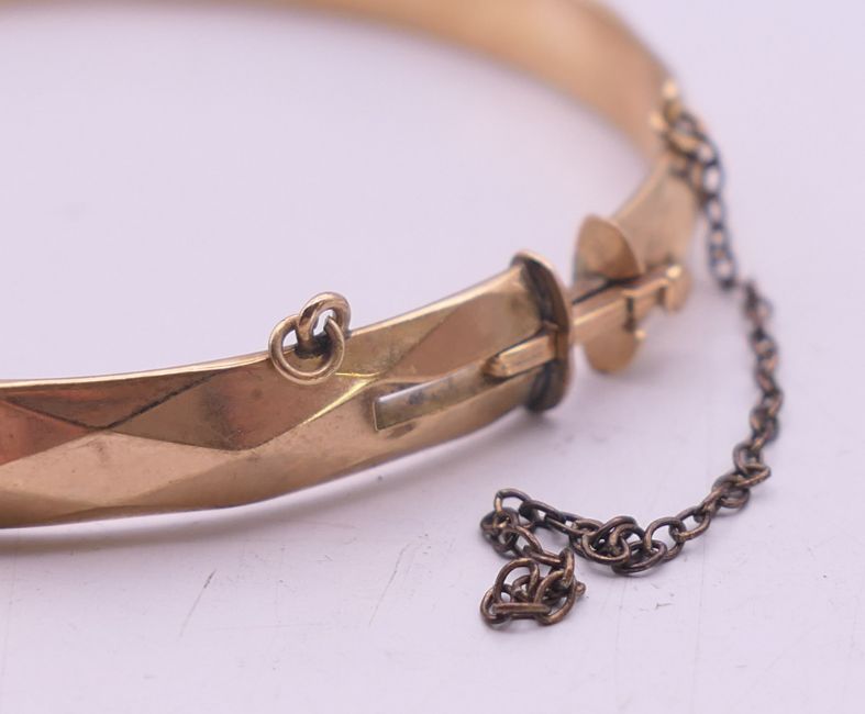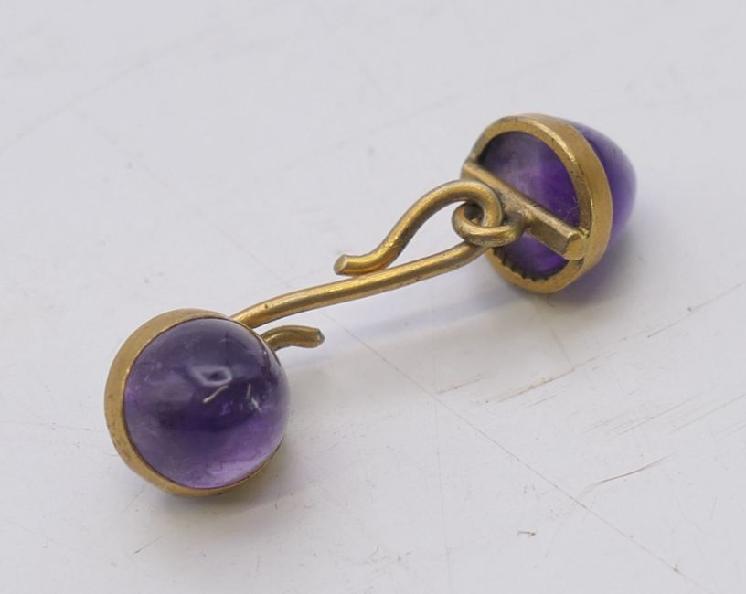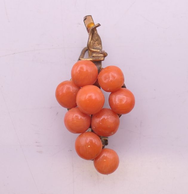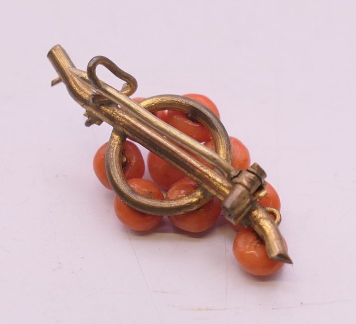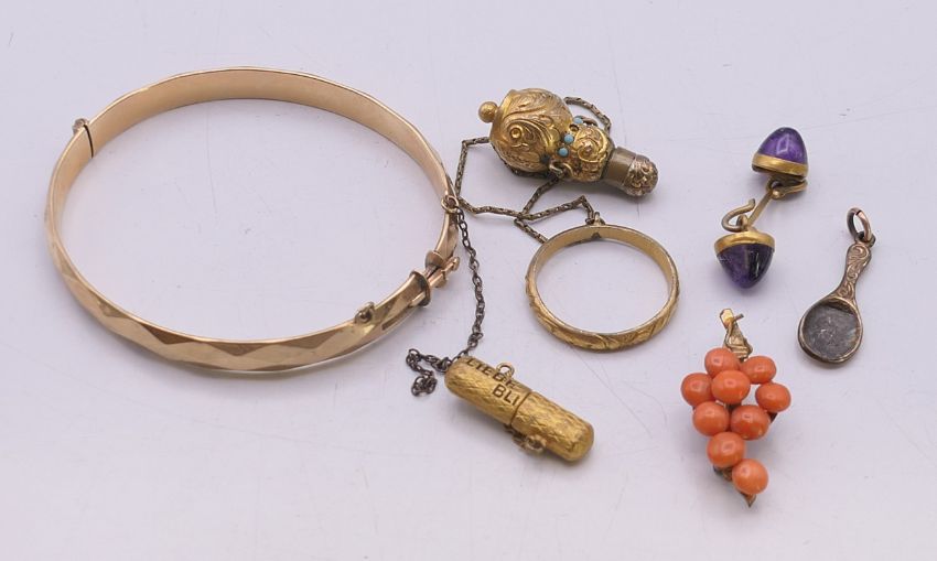 A quantity of various jewellery, to include: a 1/5th 9 ct gold bangle, a coral grapevine brooch, a miniature lorgnette case, an amethyst cufflink?, etc.