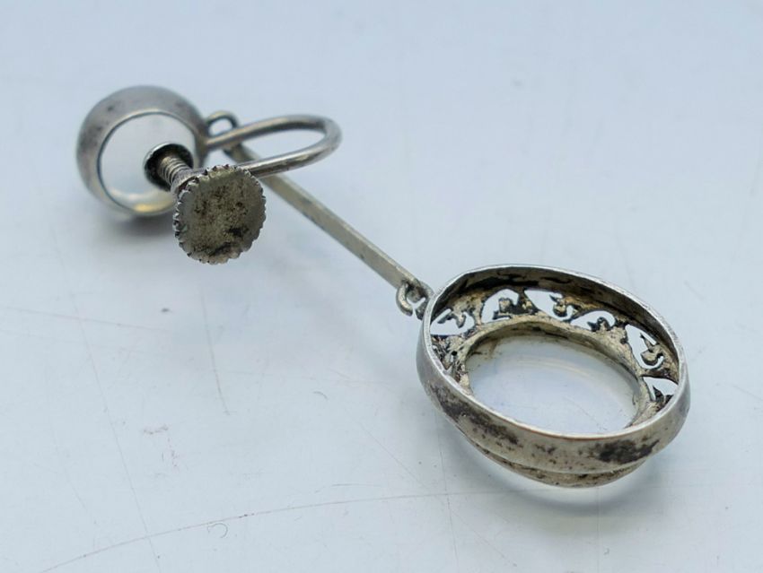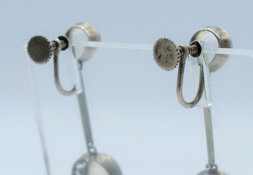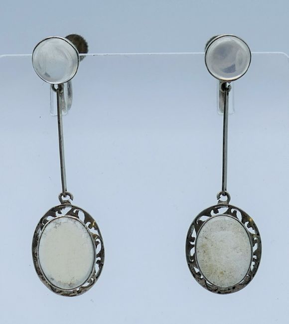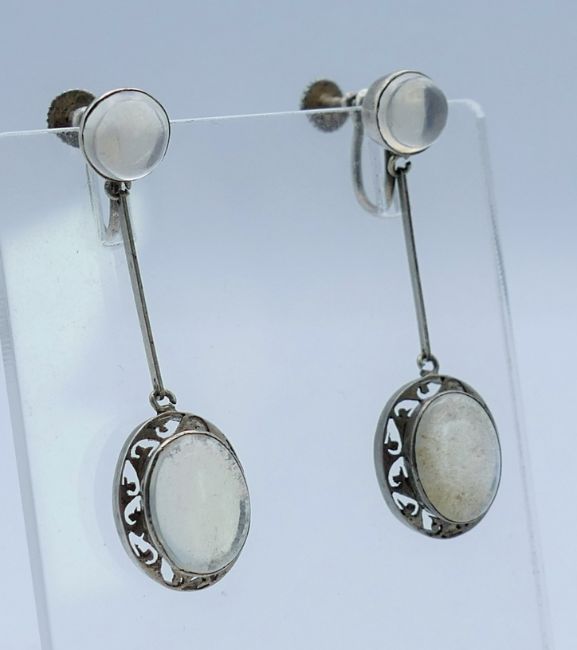 A pair of silver and moonstone earrings. 4.25 cm high.