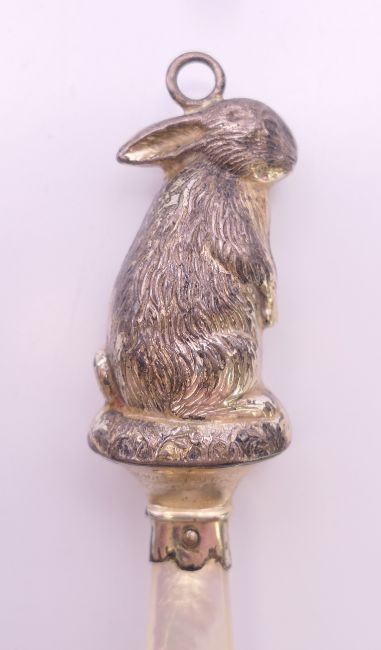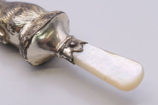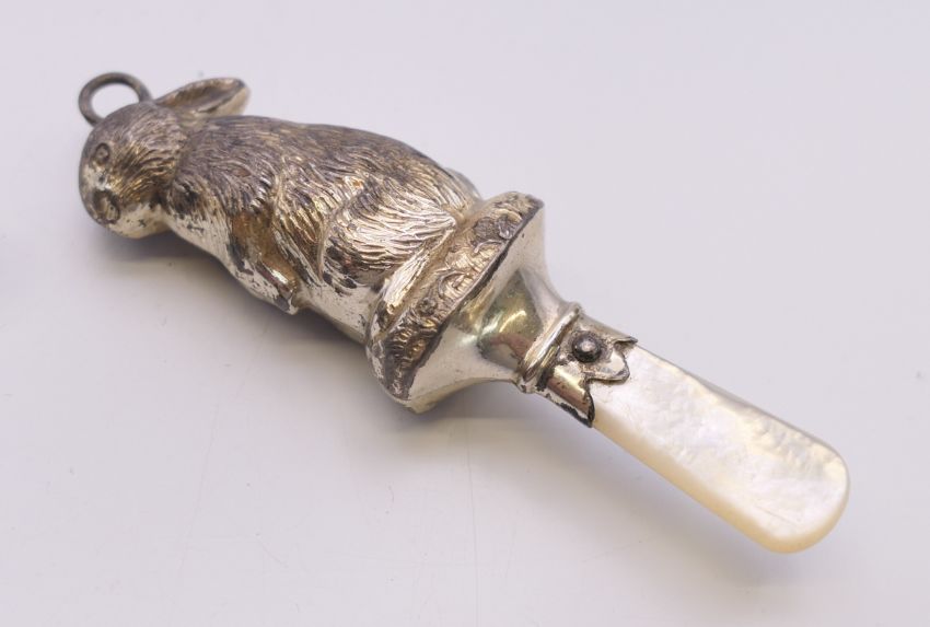 A mother-of-pearl and silver bunny rabbit rattle. 7.5 cm high.