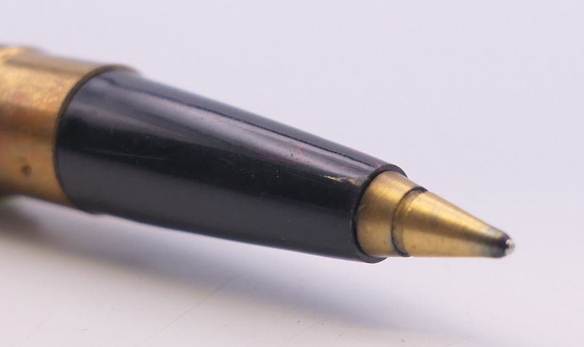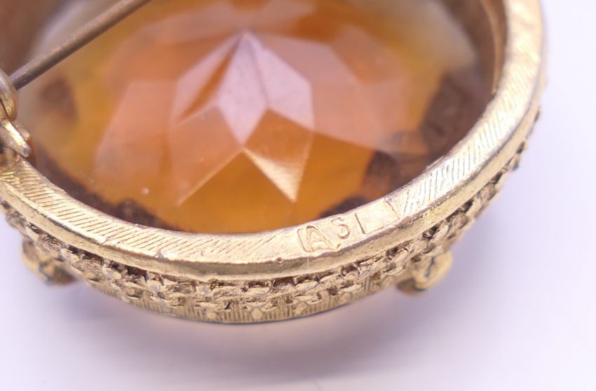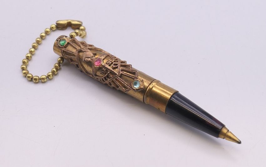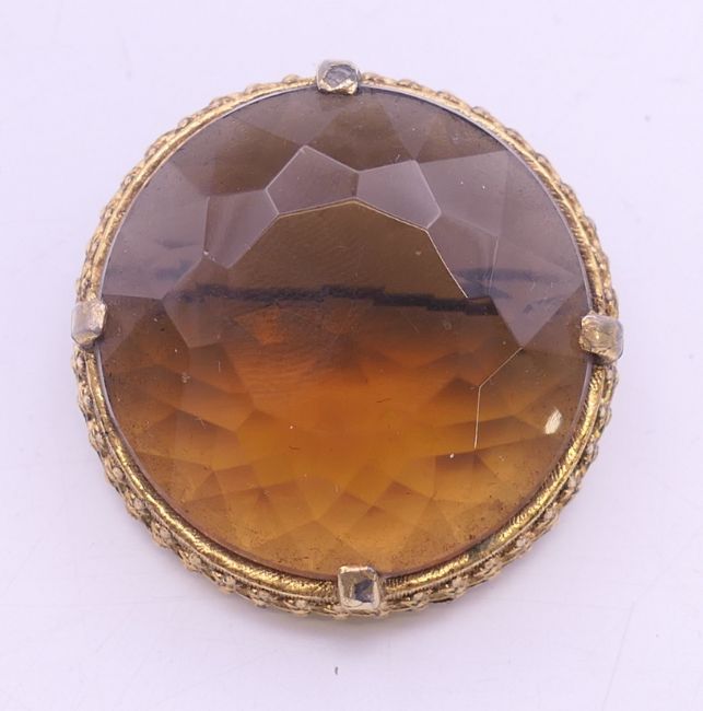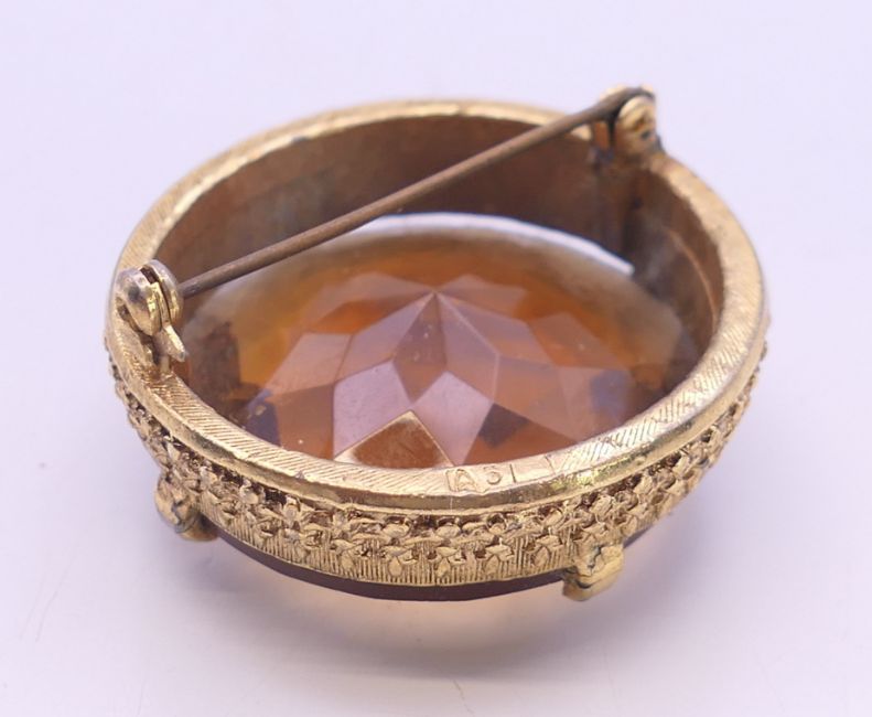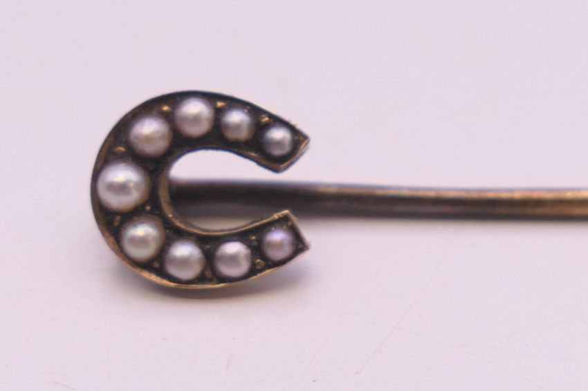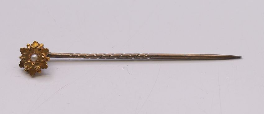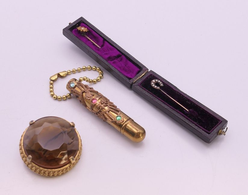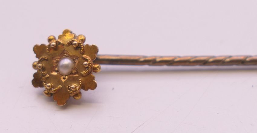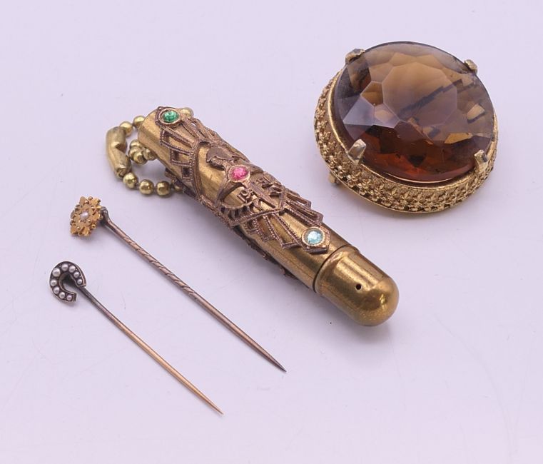 Two Victorian stick pins, a vintage pen and a brooch. Brooch 4 cm diameter.