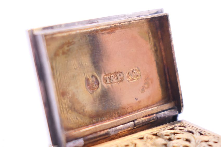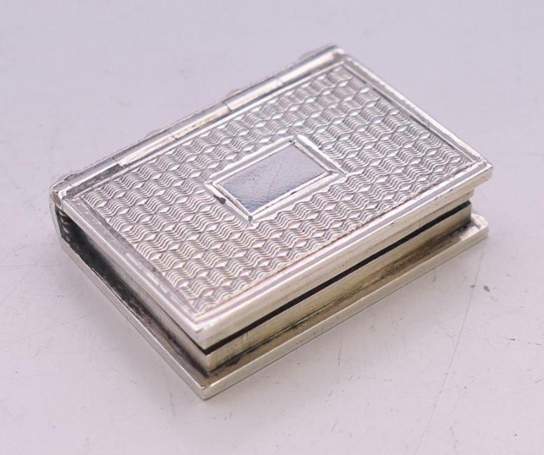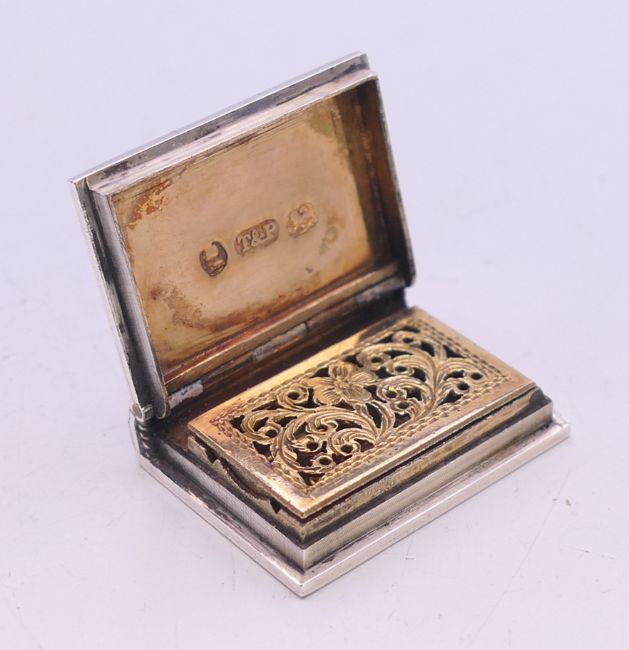 A small Georgian silver book form vinaigrette. 2 cm x 2.5 cm.
