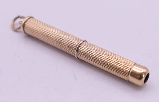 A 9 ct gold hallmarked retractable toothpick. 5.7 grammes. 5 cm closed, 7.5 cm open.