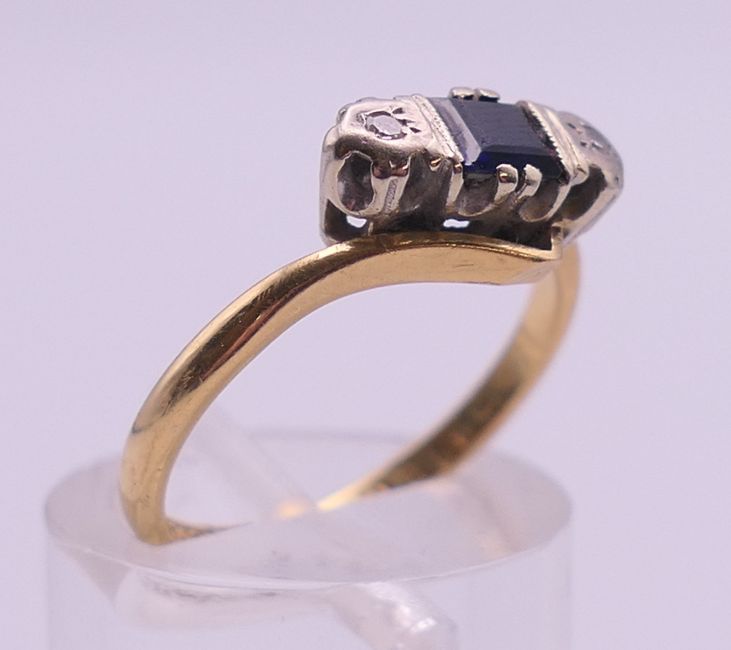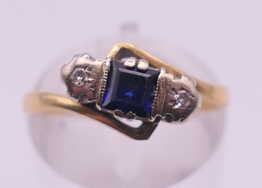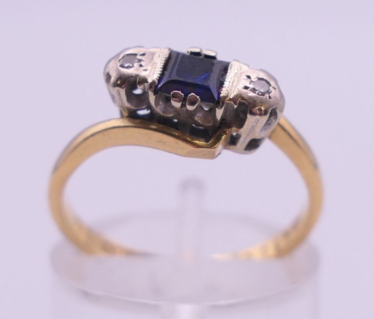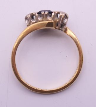 An 18 ct gold, sapphire and diamond ring. Ring size L. 3.3 grammes total weight.