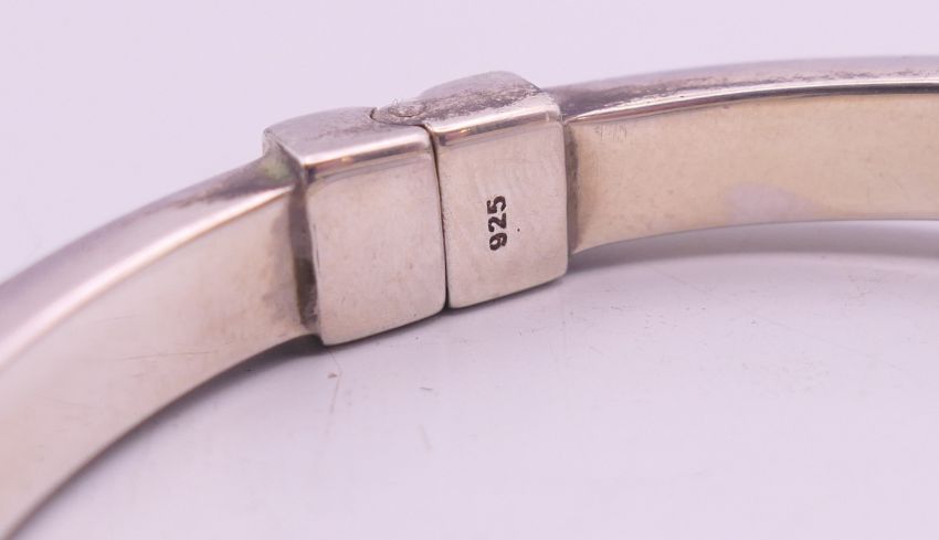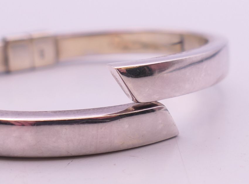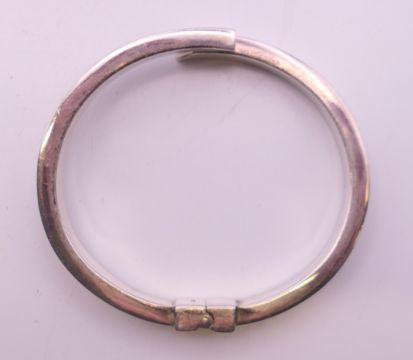 A hinged silver bangle. 5.5 cm inner diameter.