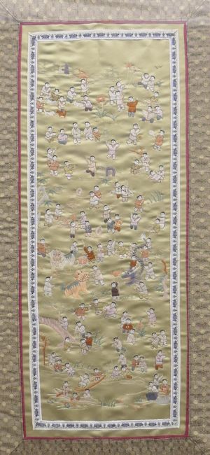 A Chinese silk sleeve panel, framed and glazed. 43 x 77.5 cm overall.