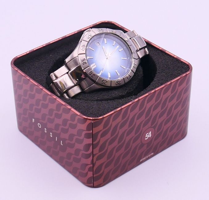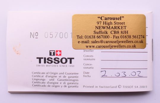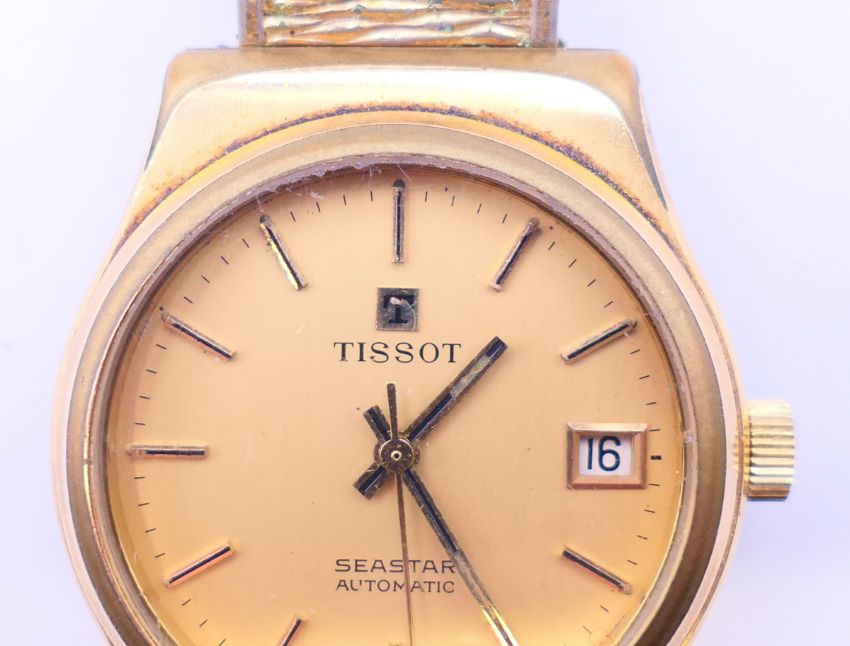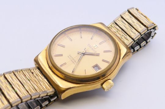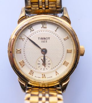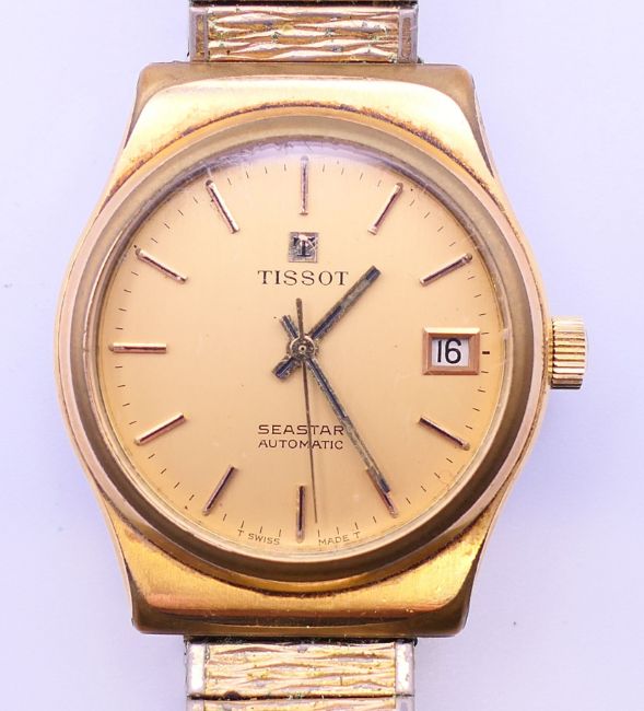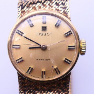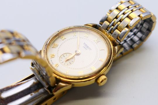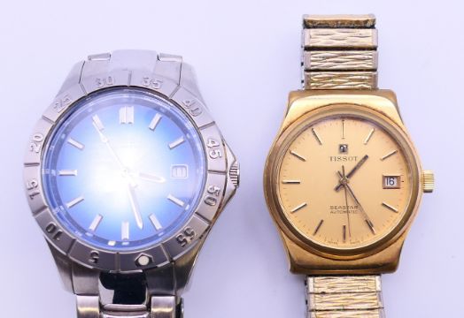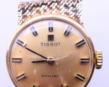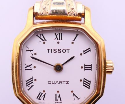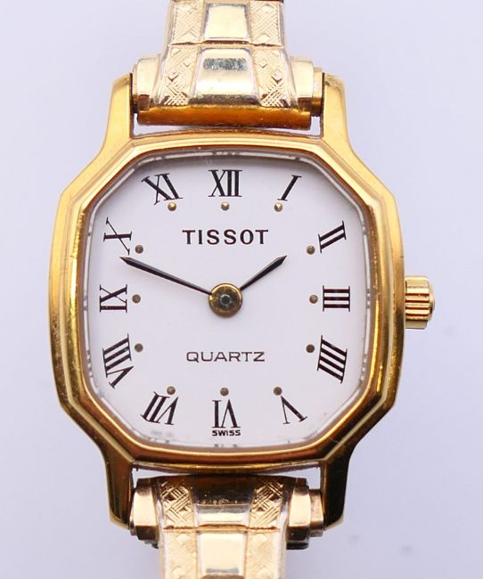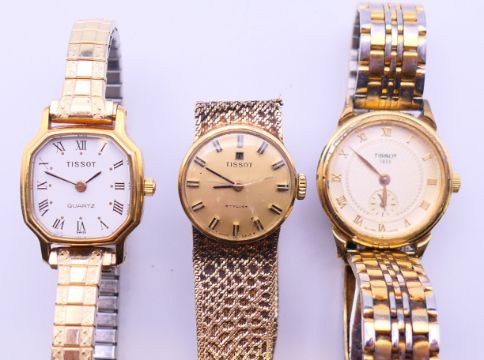 Three ladies' Tissot wristwatches, a boxed Gentlemen's Tissot wristwatch and a boxed gentlemen's Fossil wristwatch. The latter 4.2 cm wide.
